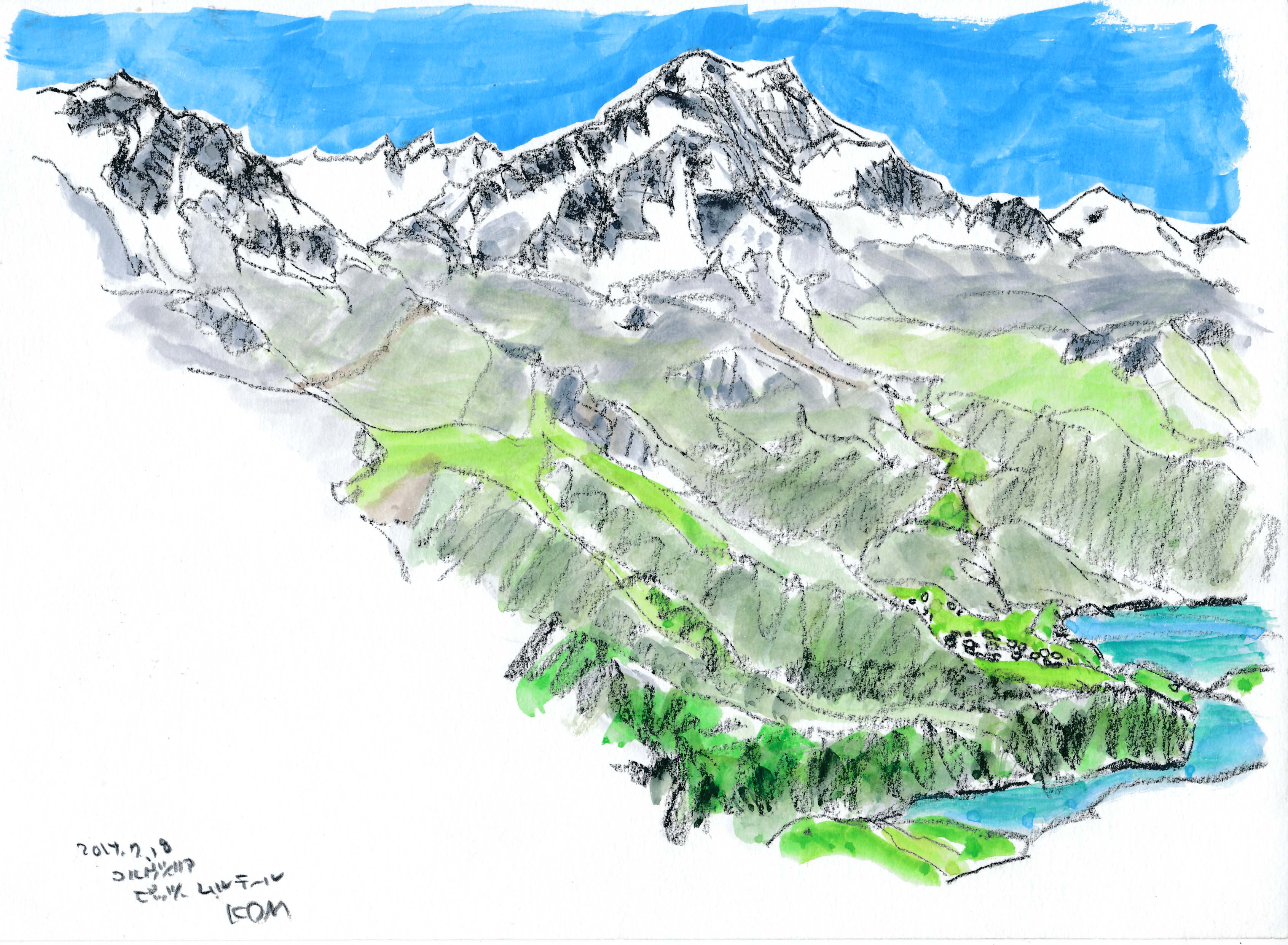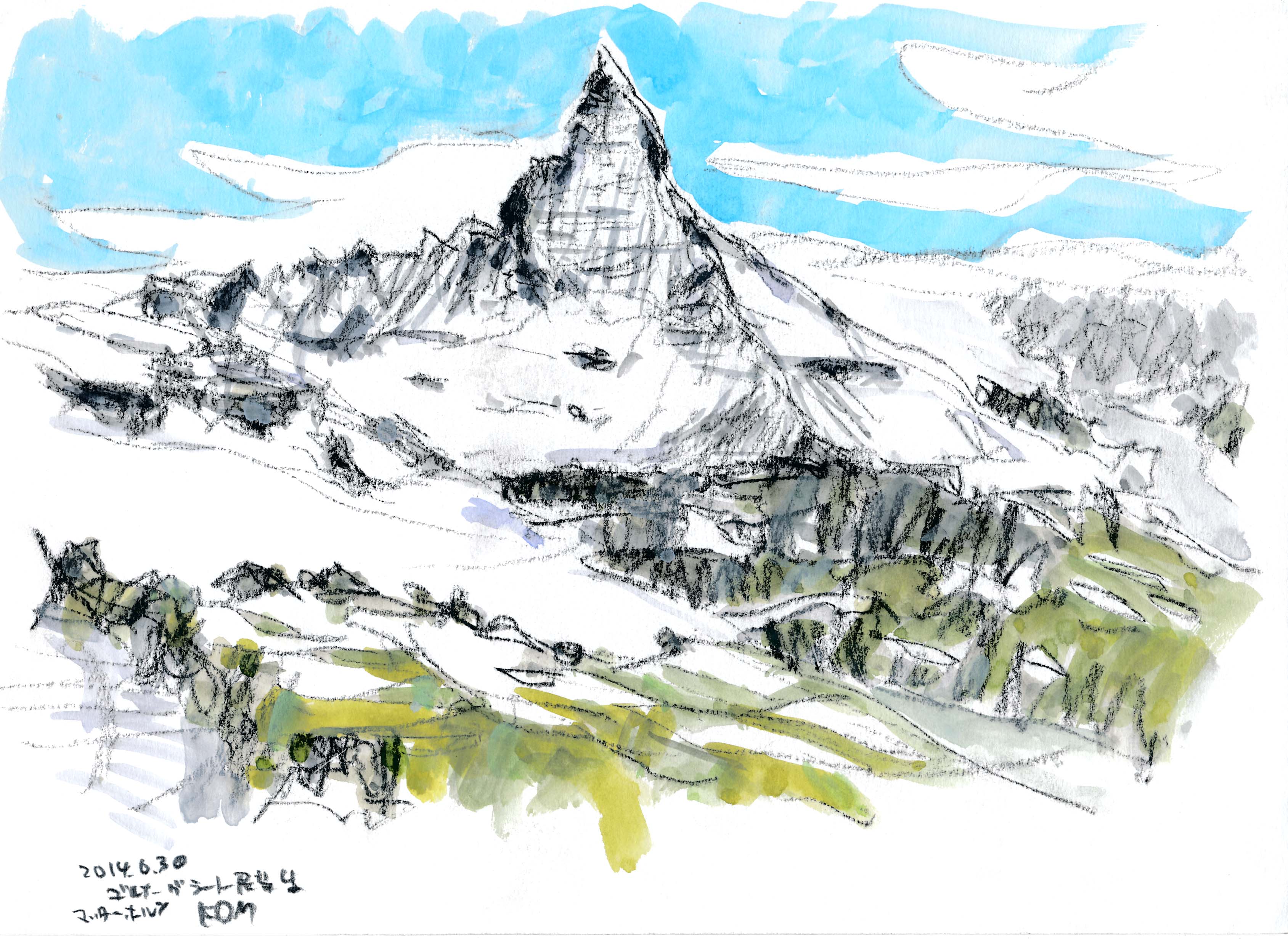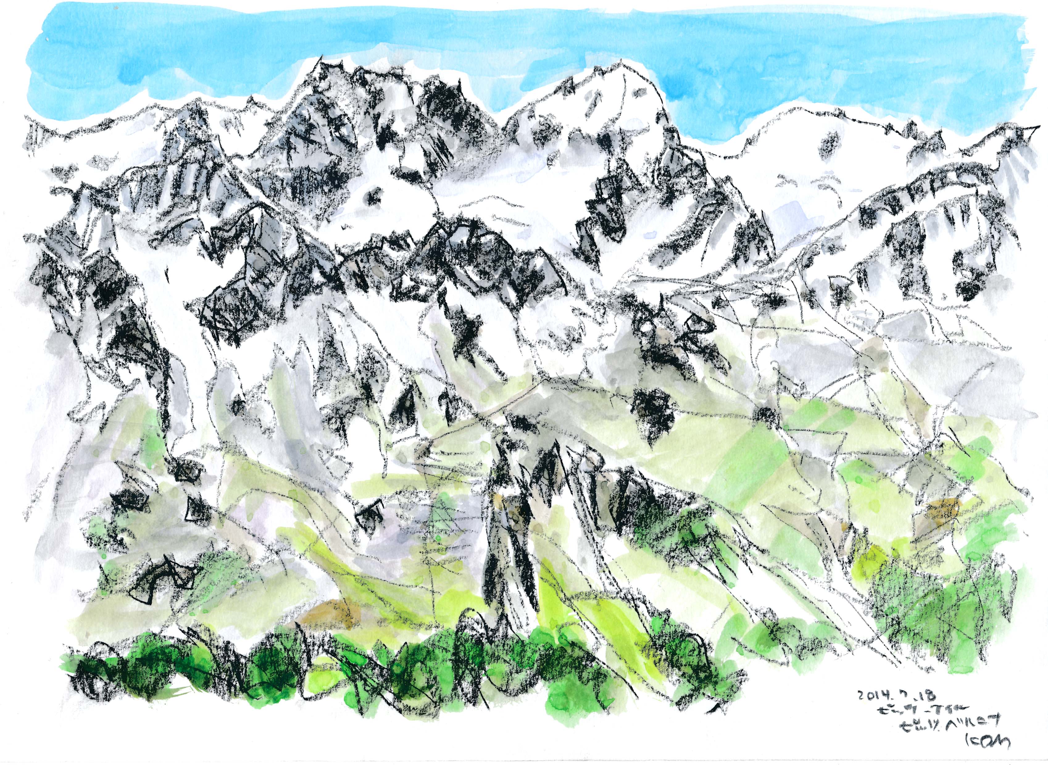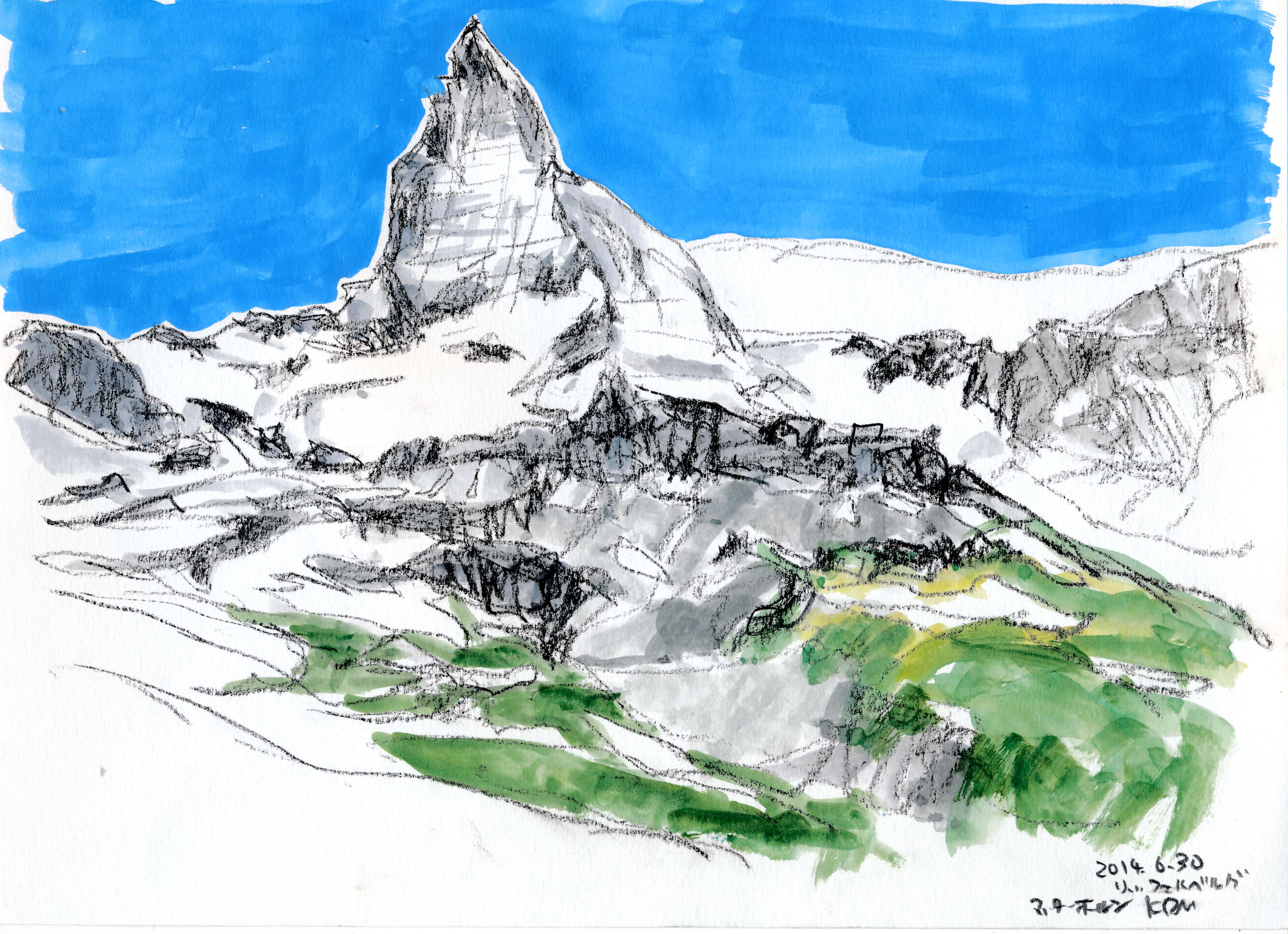 今年もスイスでスケッチを描く事が出来た。スイスも日本と同じく気象異常で、天気は落ち着かなく、グリンデルワルトでは4日間も雨が続いていた。描こうと思っていたシャモニ-のモンブラン、スネガのマッタ-ホルン、メンリッヘンのアイガ-・メンヒ・ユングフラウ3山は不調に終わった。でも、時たま見せたスイスの山々の素晴らしさは、素敵な思い出を残す事が出来た。