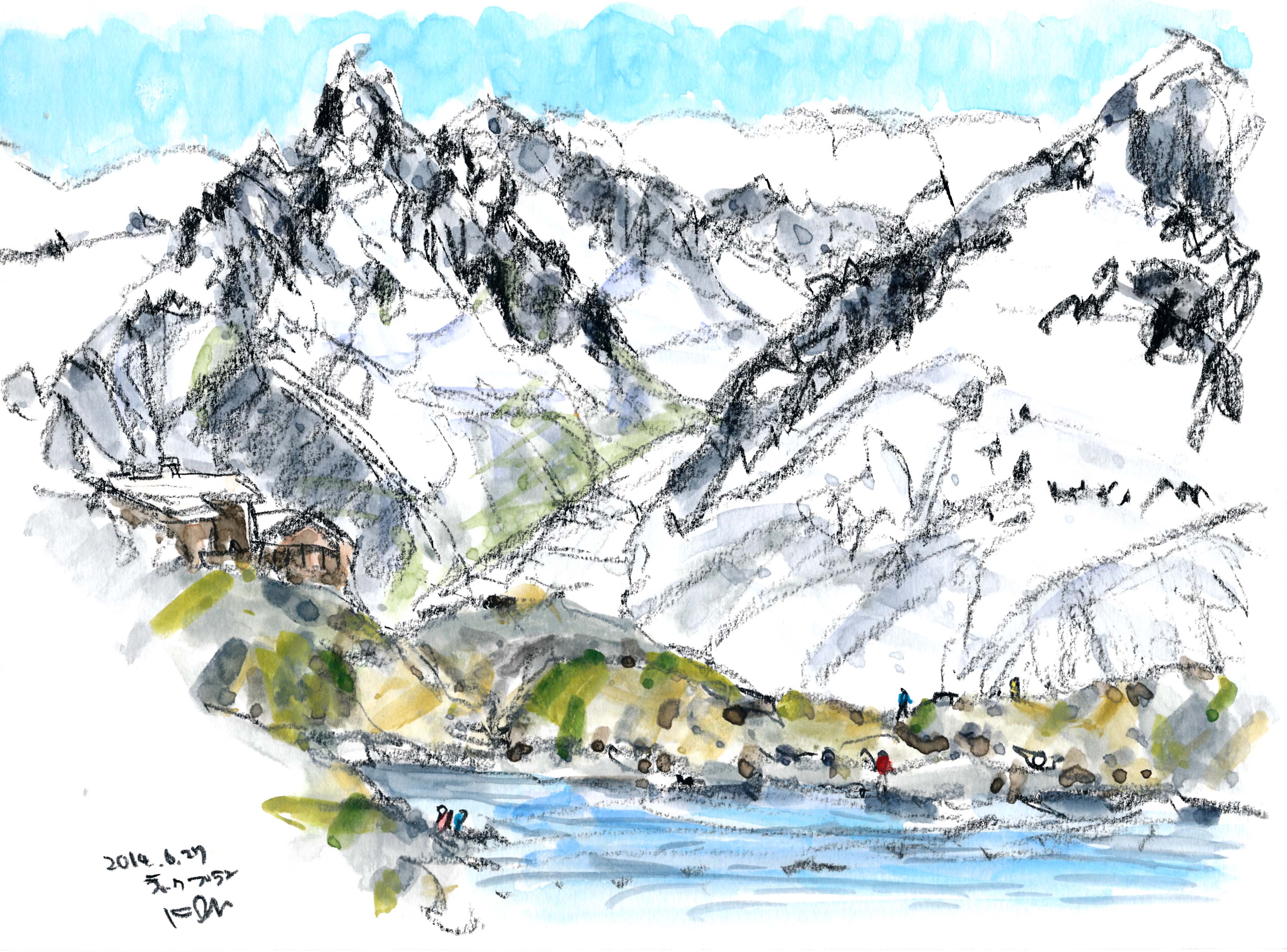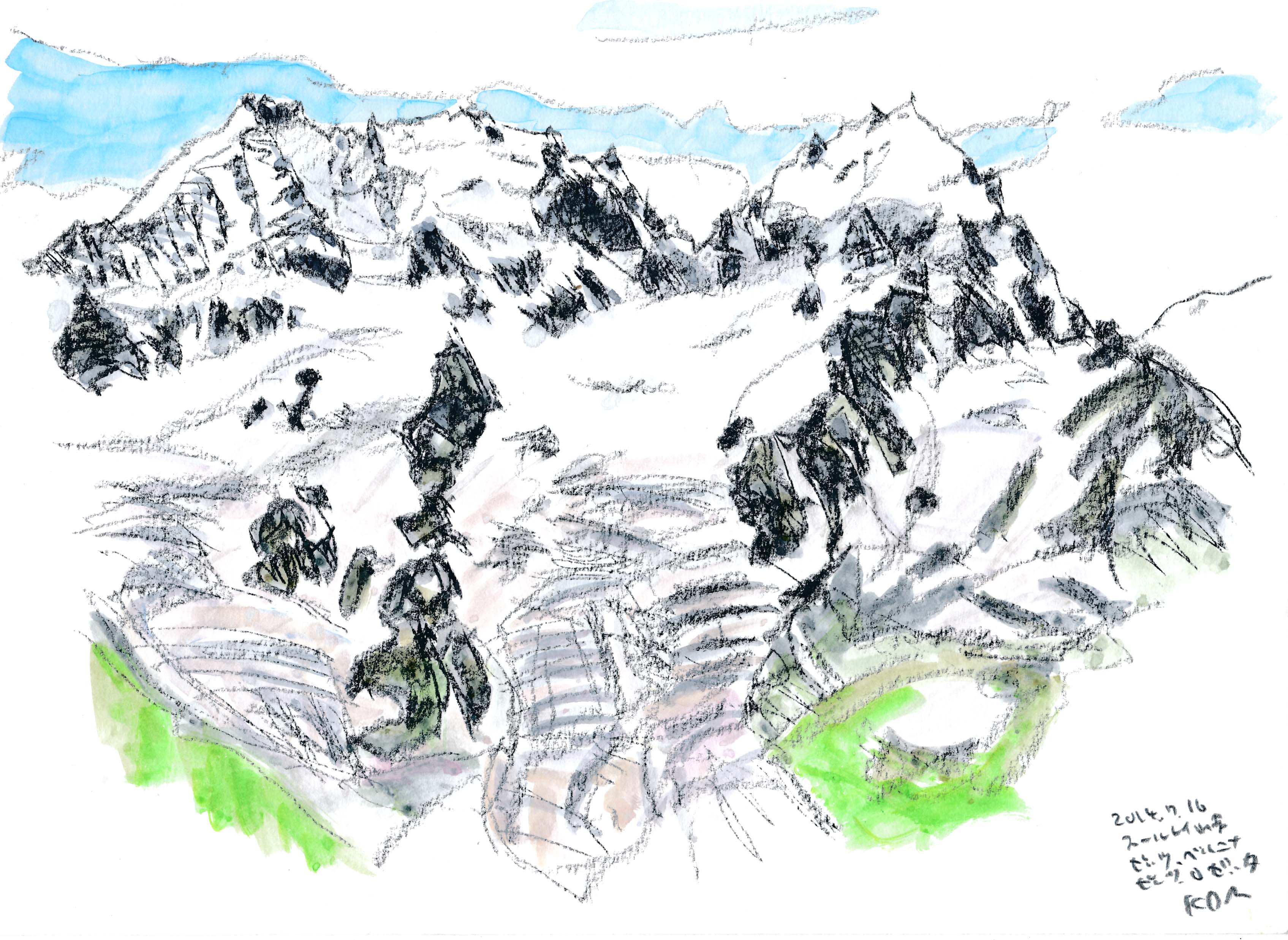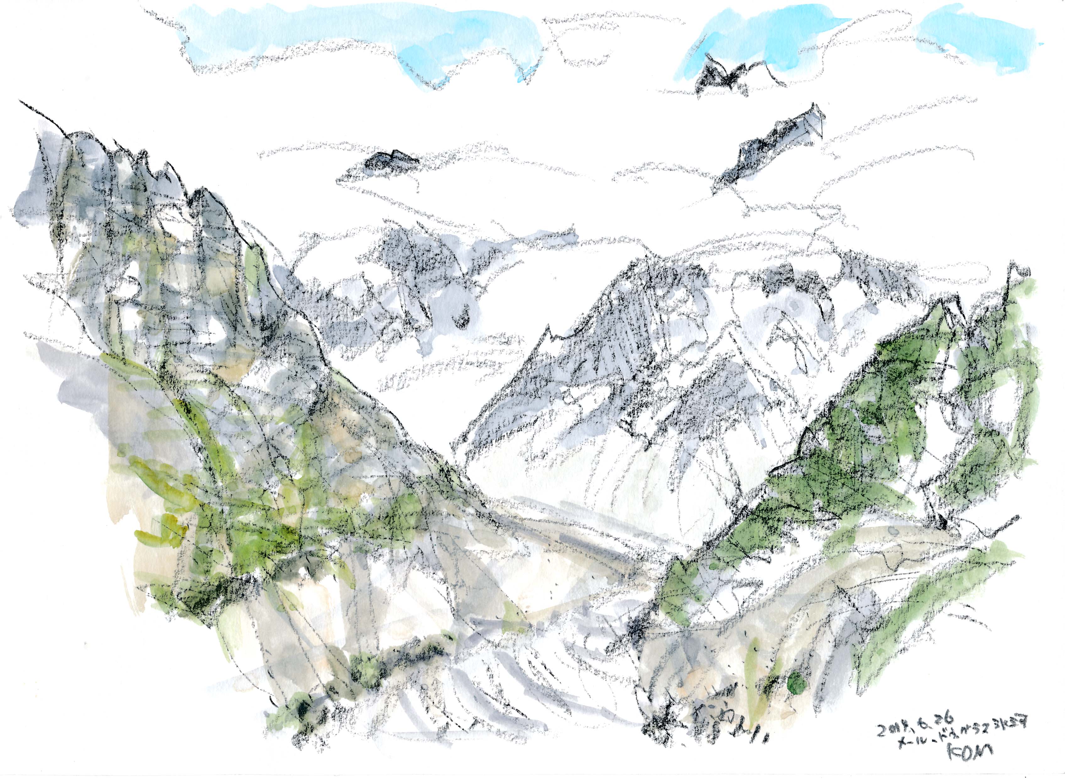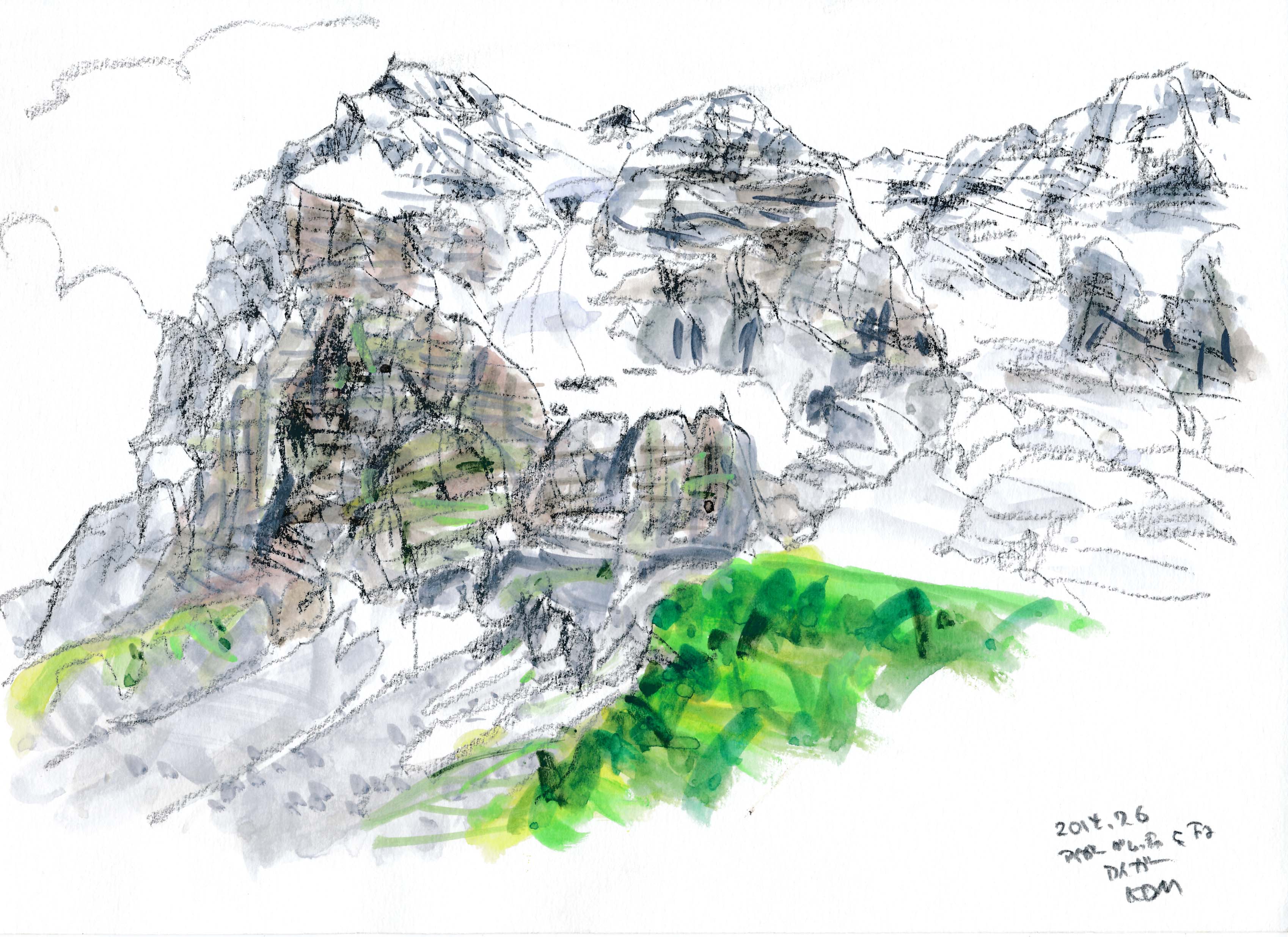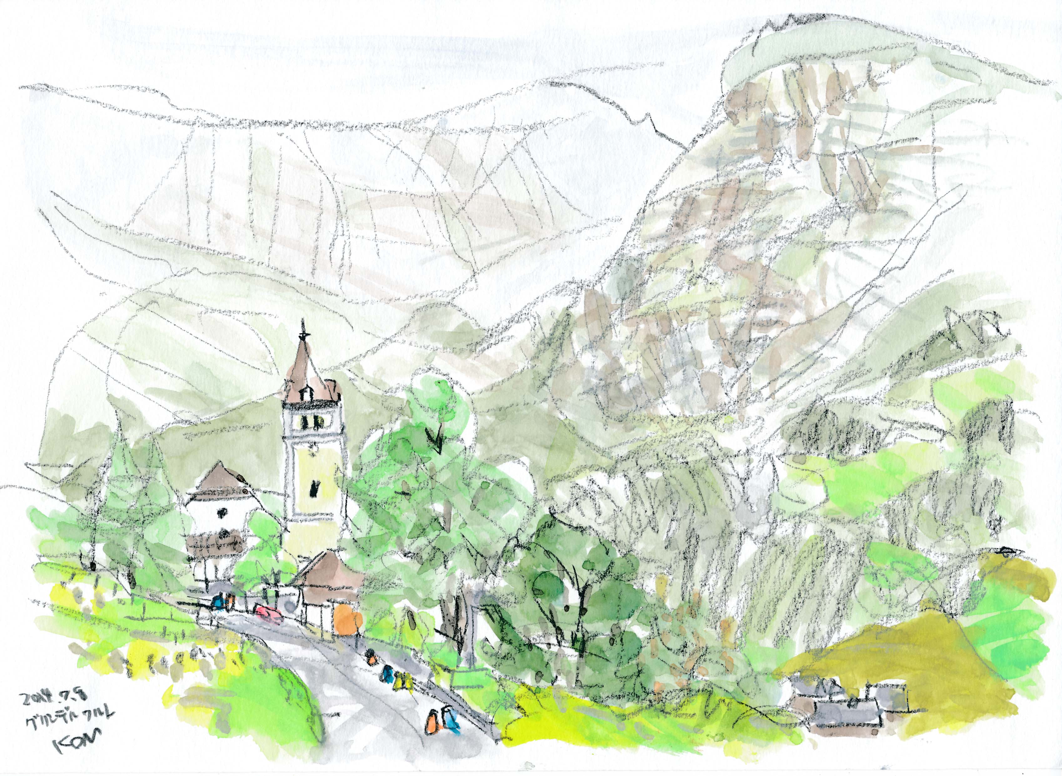 今年もスイスでスケッチを描く事が出来た。スイスも日本と同じく気象異常で、天気は落ち着かなく、グリンデルワルトでは4日間も雨が続いていた。描こうと思っていたシャモニ-のモンブラン、スネガのマッタ-ホルン、メンリッヘンのアイガ-・メンヒ・ユングフラウ3山は不調に終わった。でも、時たま見せたスイスの山々の素晴らしさは、素敵な思い出を残す事が出来た。