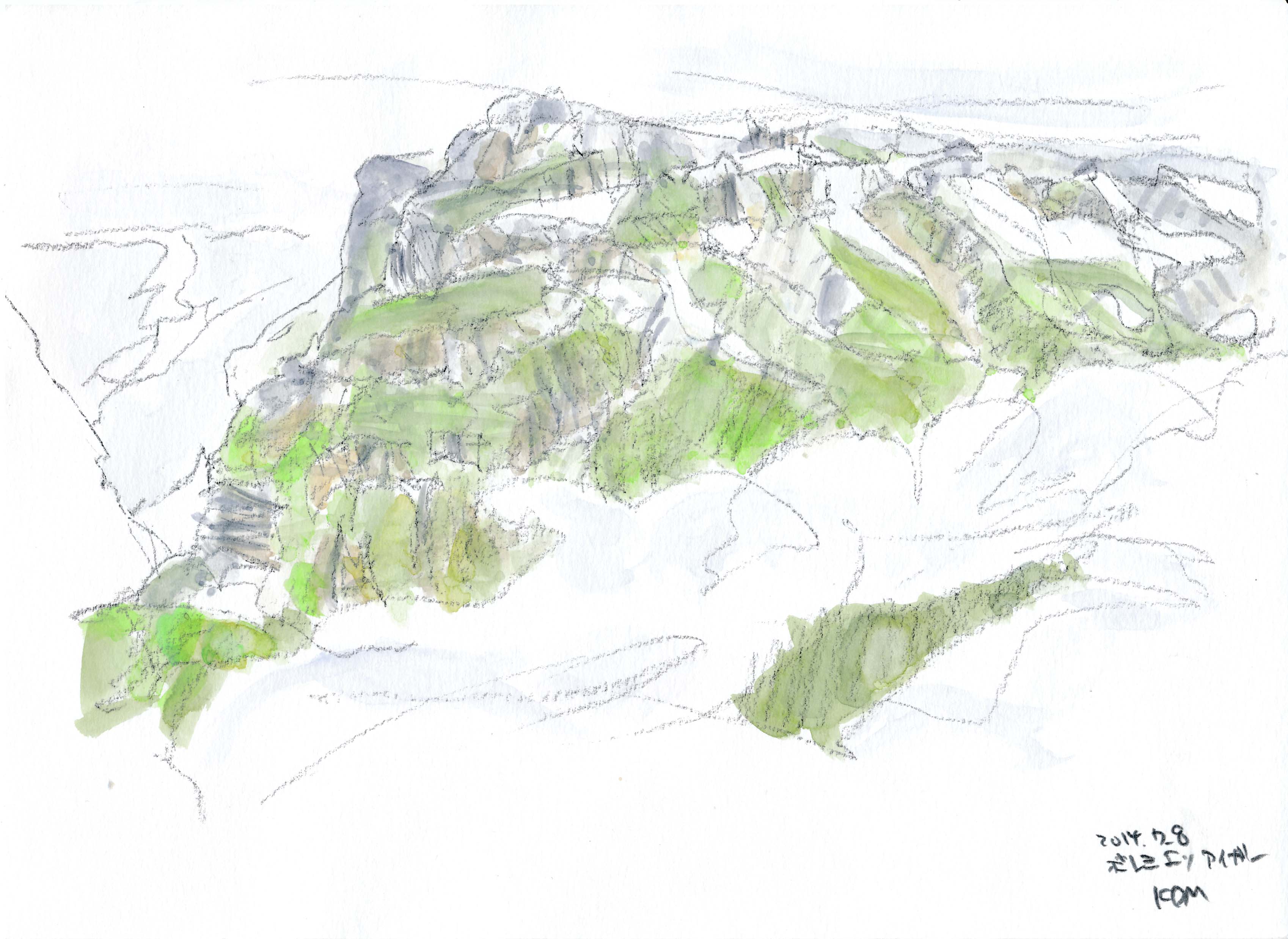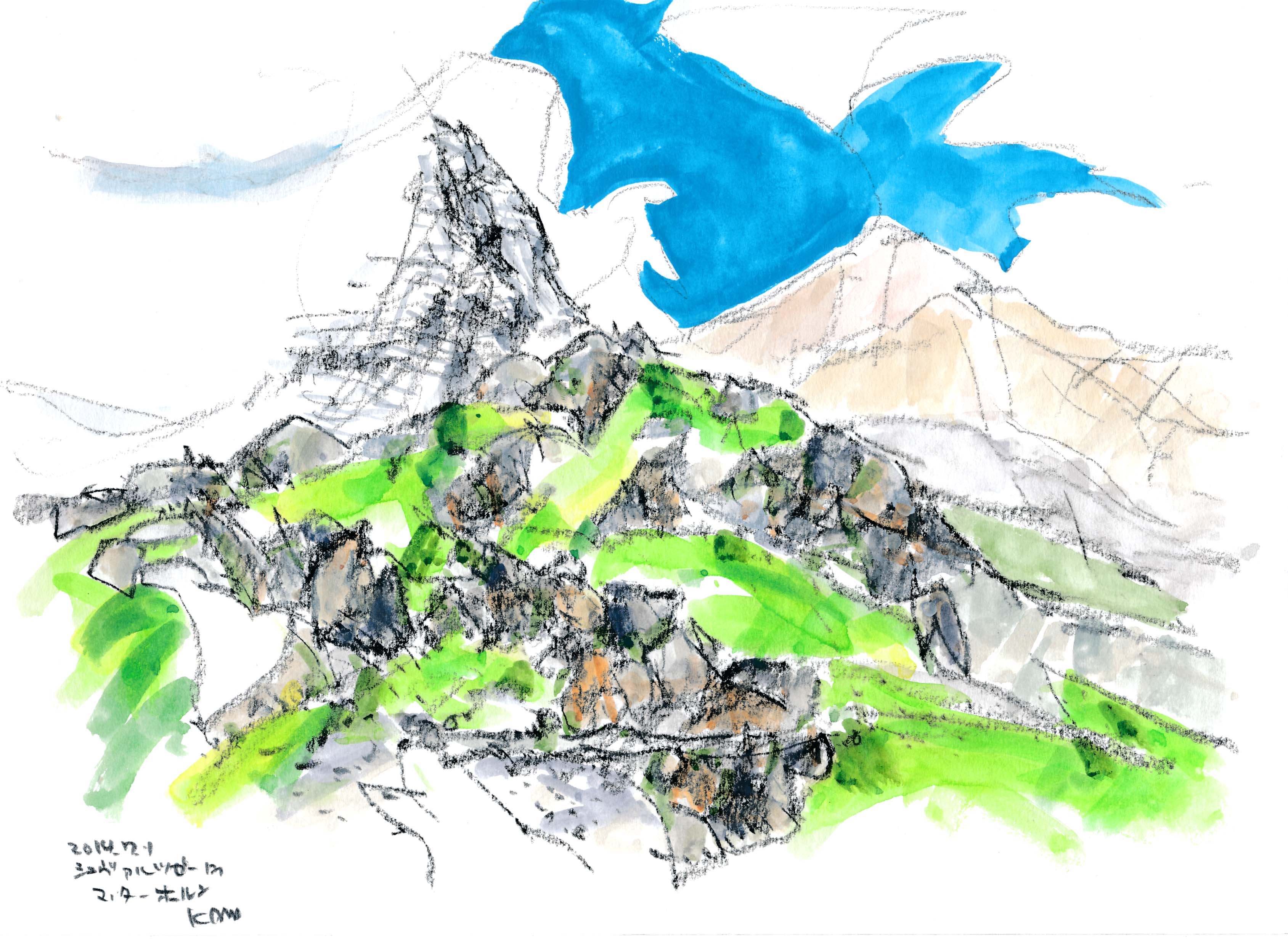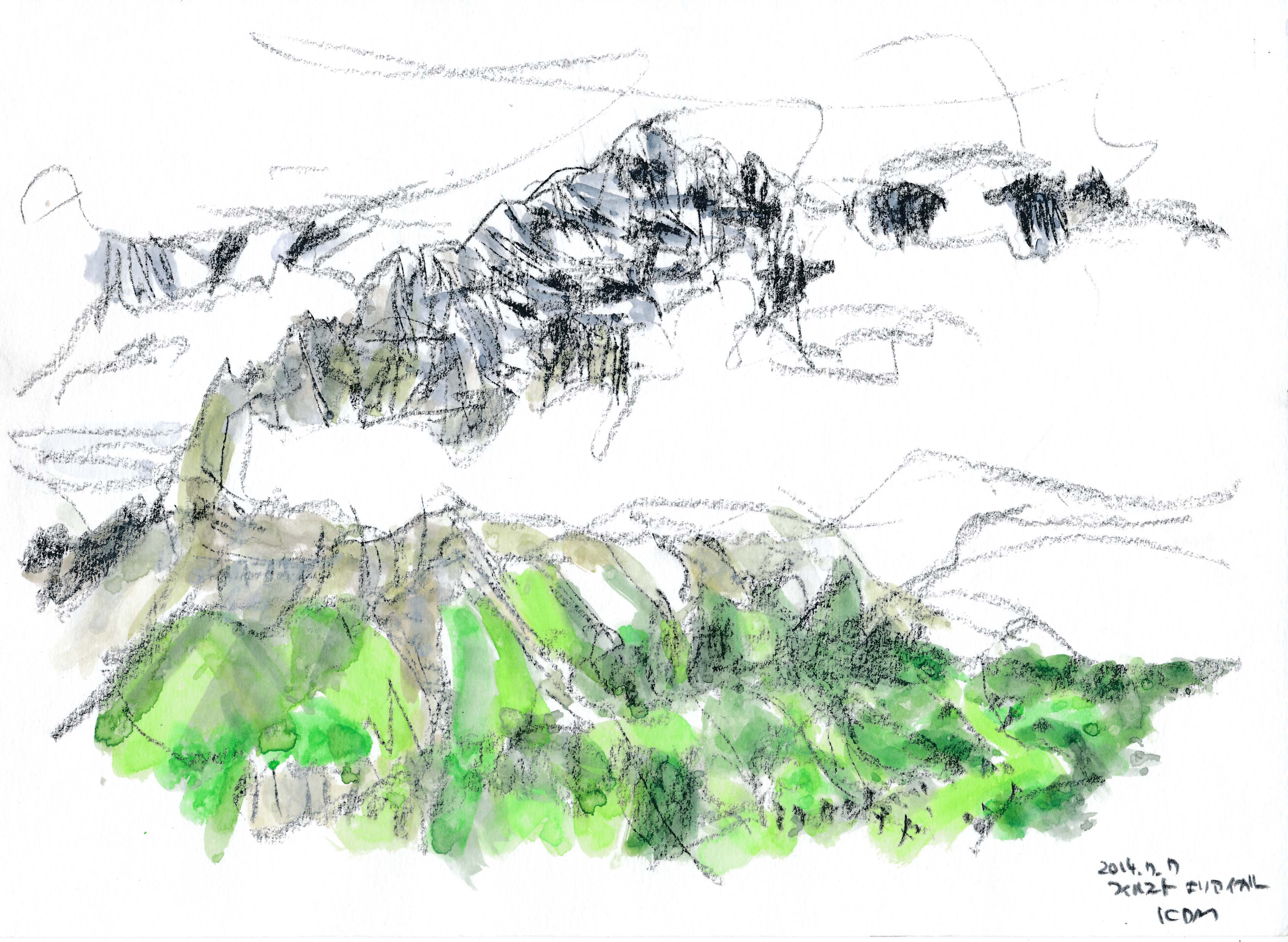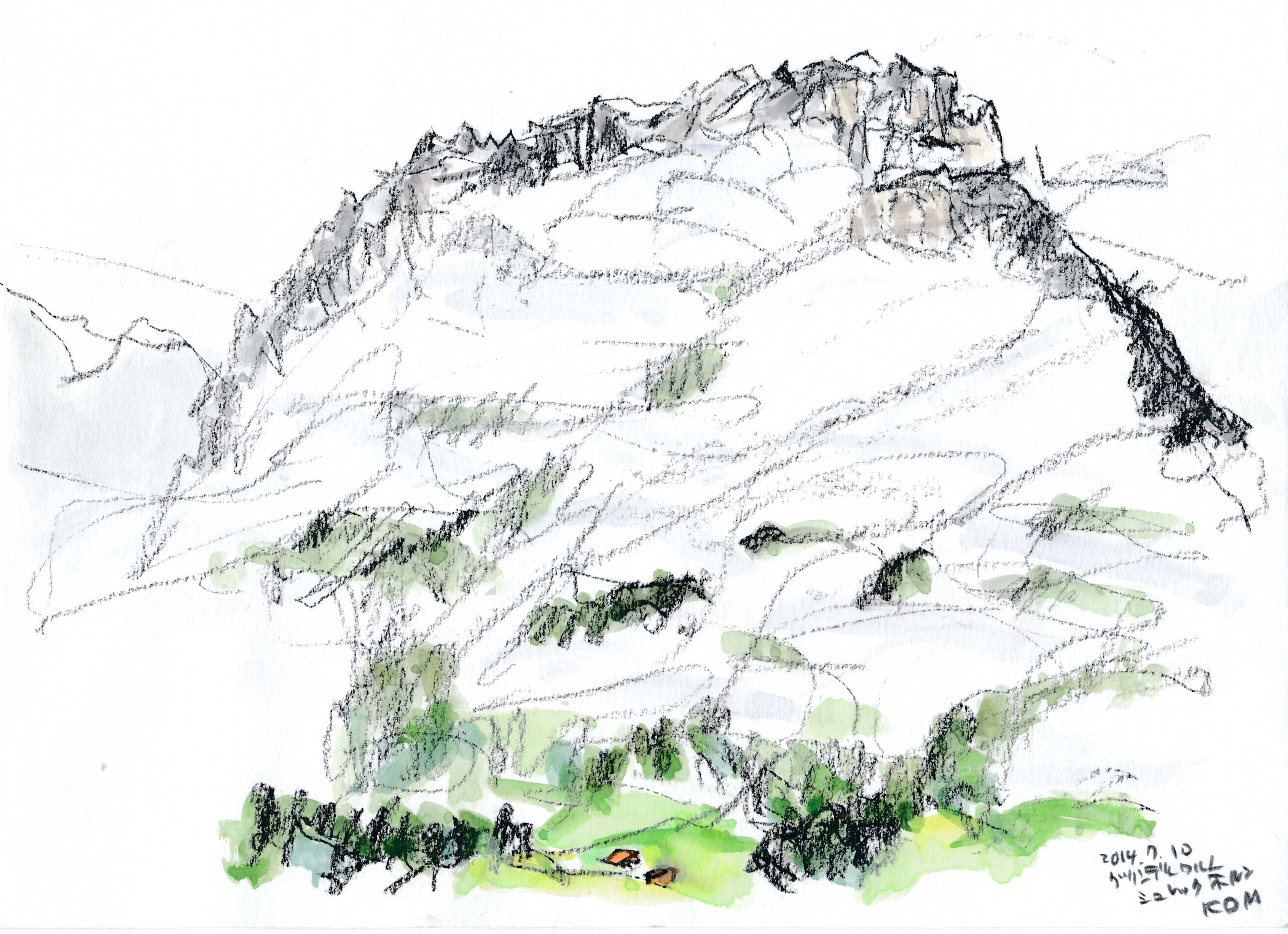今年もスイスでスケッチを描く事が出来た。スイスも日本と同じく気象異常で、天気は落ち着かなく、グリンデルワルトでは4日間も雨が続いていた。描こうと思っていたシャモニ-のモンブラン、スネガのマッタ-ホルン、メンリッヘンのアイガ-・メンヒ・ユングフラウ3山は不調に終わった。でも、時たま見せたスイスの山々の素晴らしさは、素敵な思い出を残す事が出来た。