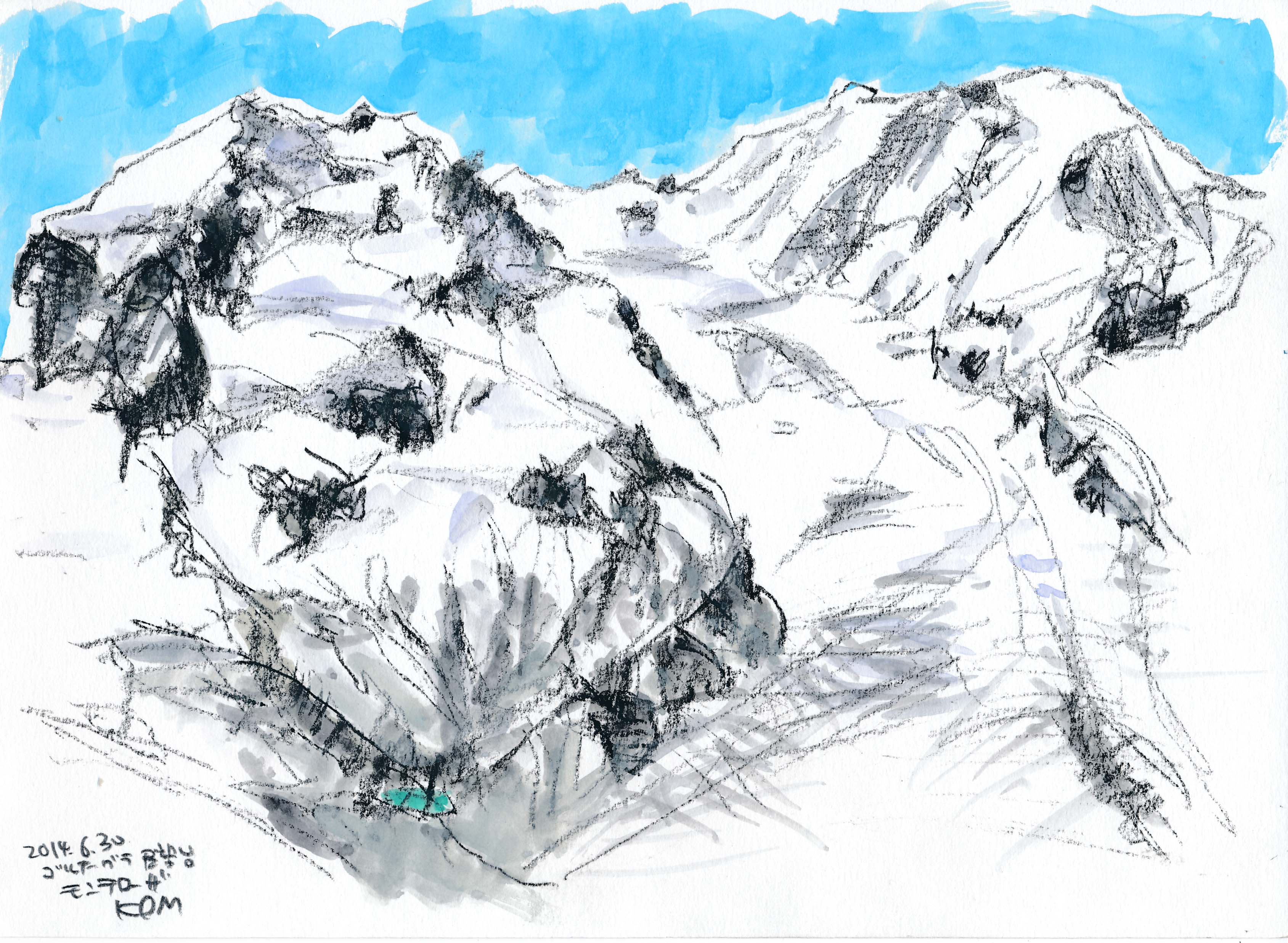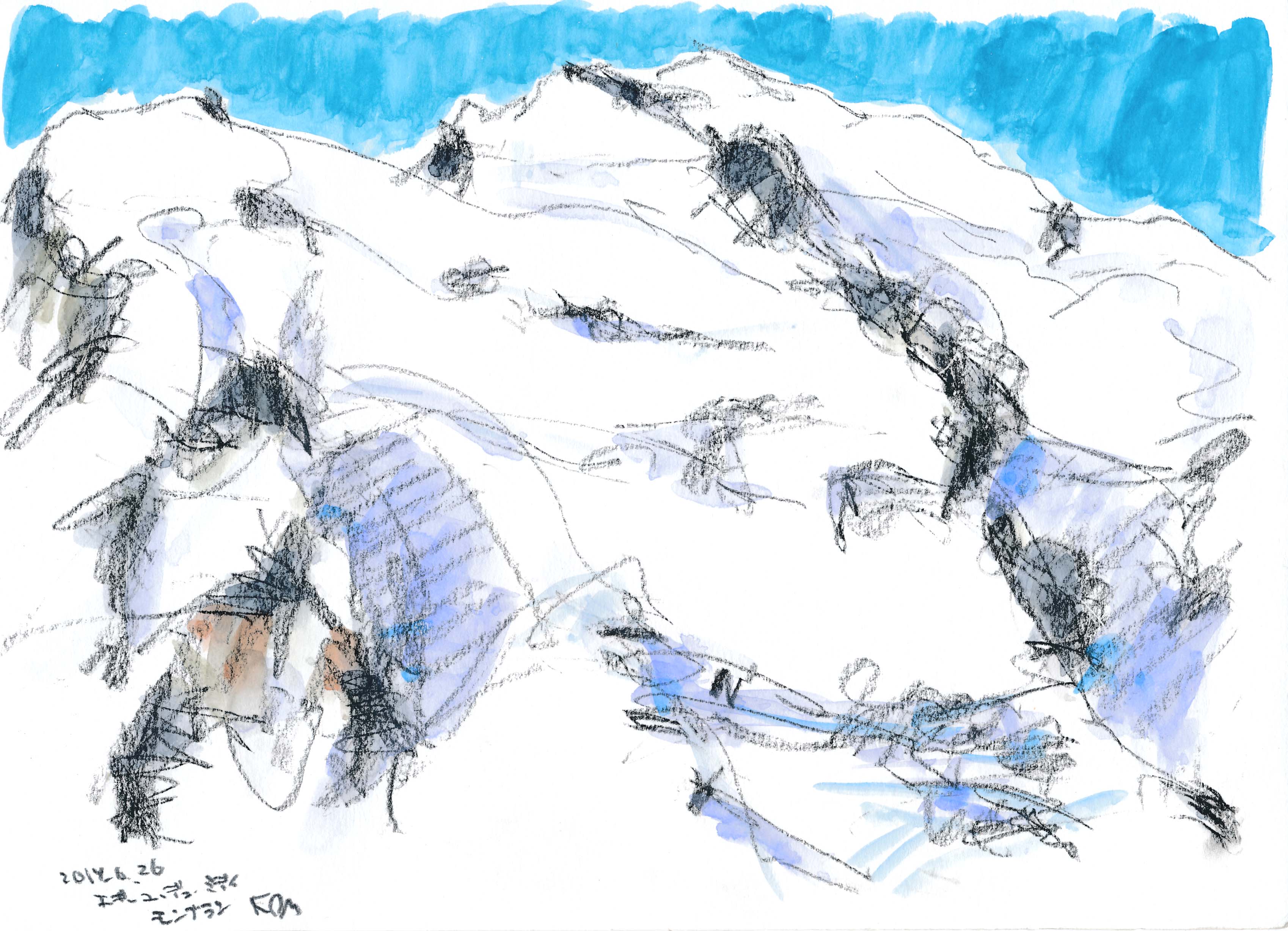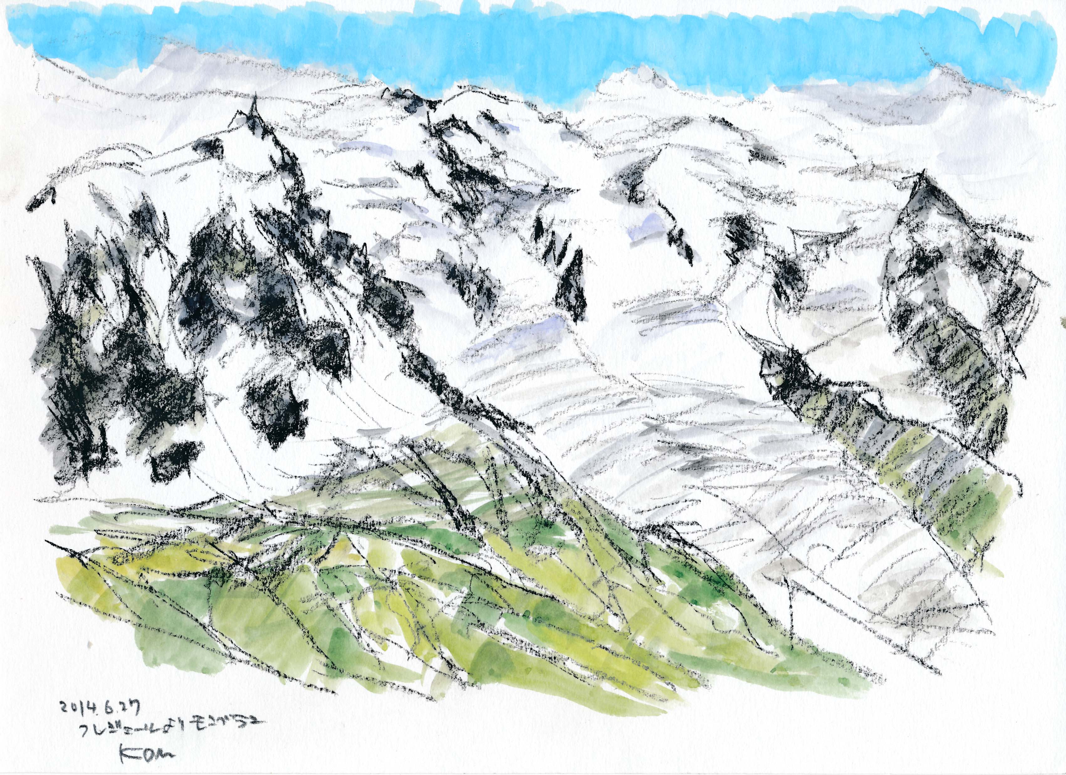 ■ラ・フレジェ-ルから対面するモン・ブラン4807mを描く。まだグランド・ジュラス北壁は雲に隠れていた。