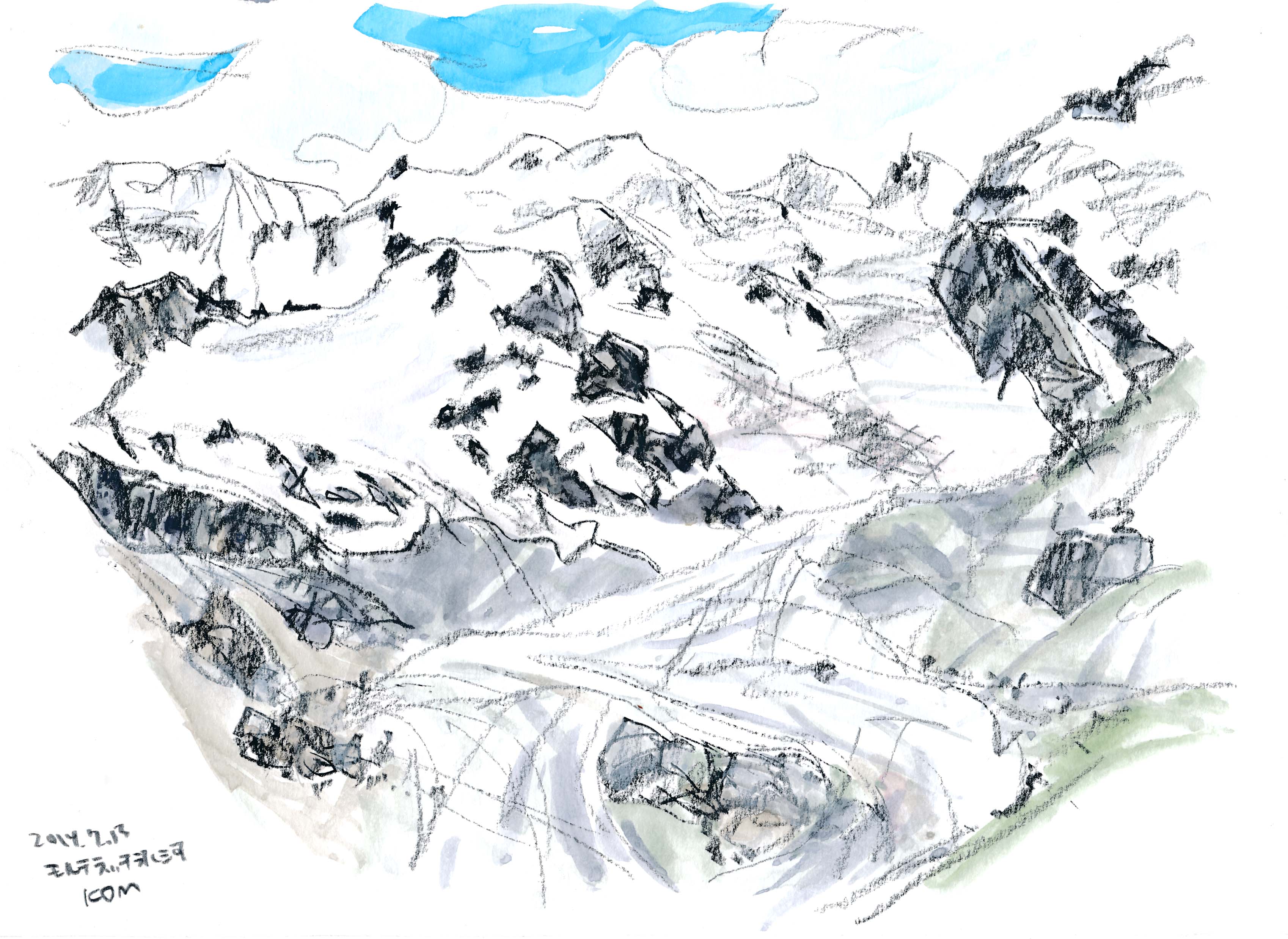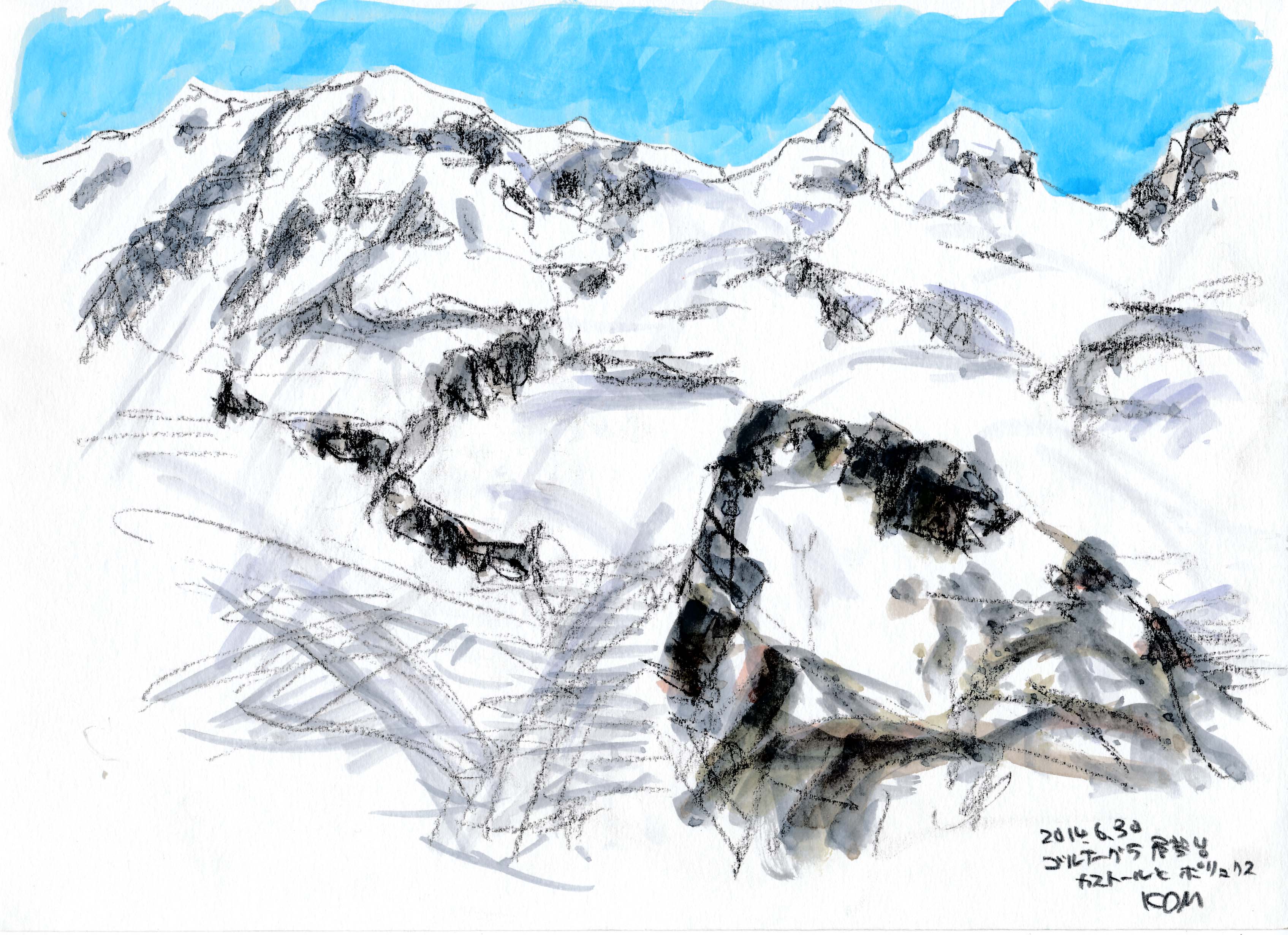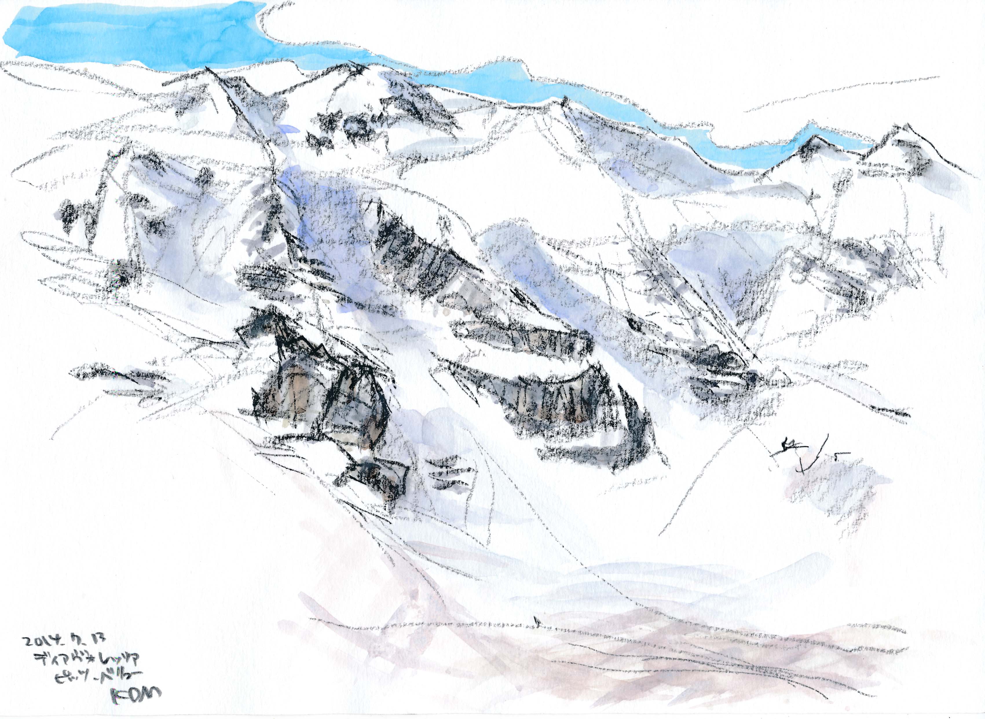 ■コルヴァッチ展望台3298mからピッツ・ムルテル3433mが正面に見える。ピッツ・ロゼッタ3937m、ピッツ・ベルニナ4048mを望むが、雲に隠れている。翌日再訪。ピッツ・ベルニナが描けた。