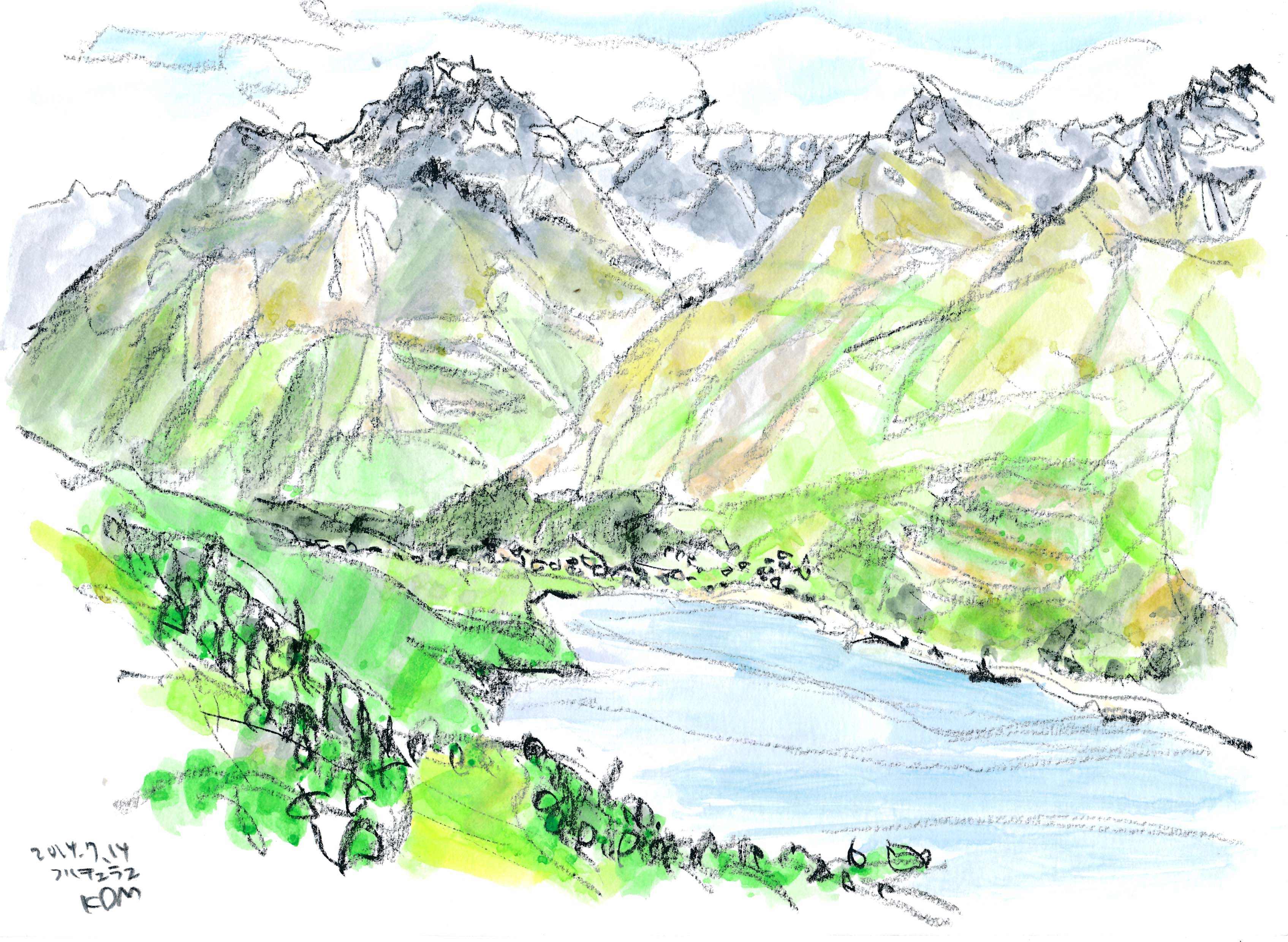■ランデックス2385mからラ・フレジェ-ル1877mを歩く。ラック・プラン2352mでは、昼食の合間に周囲の山並みを映す湖をスケッチする。