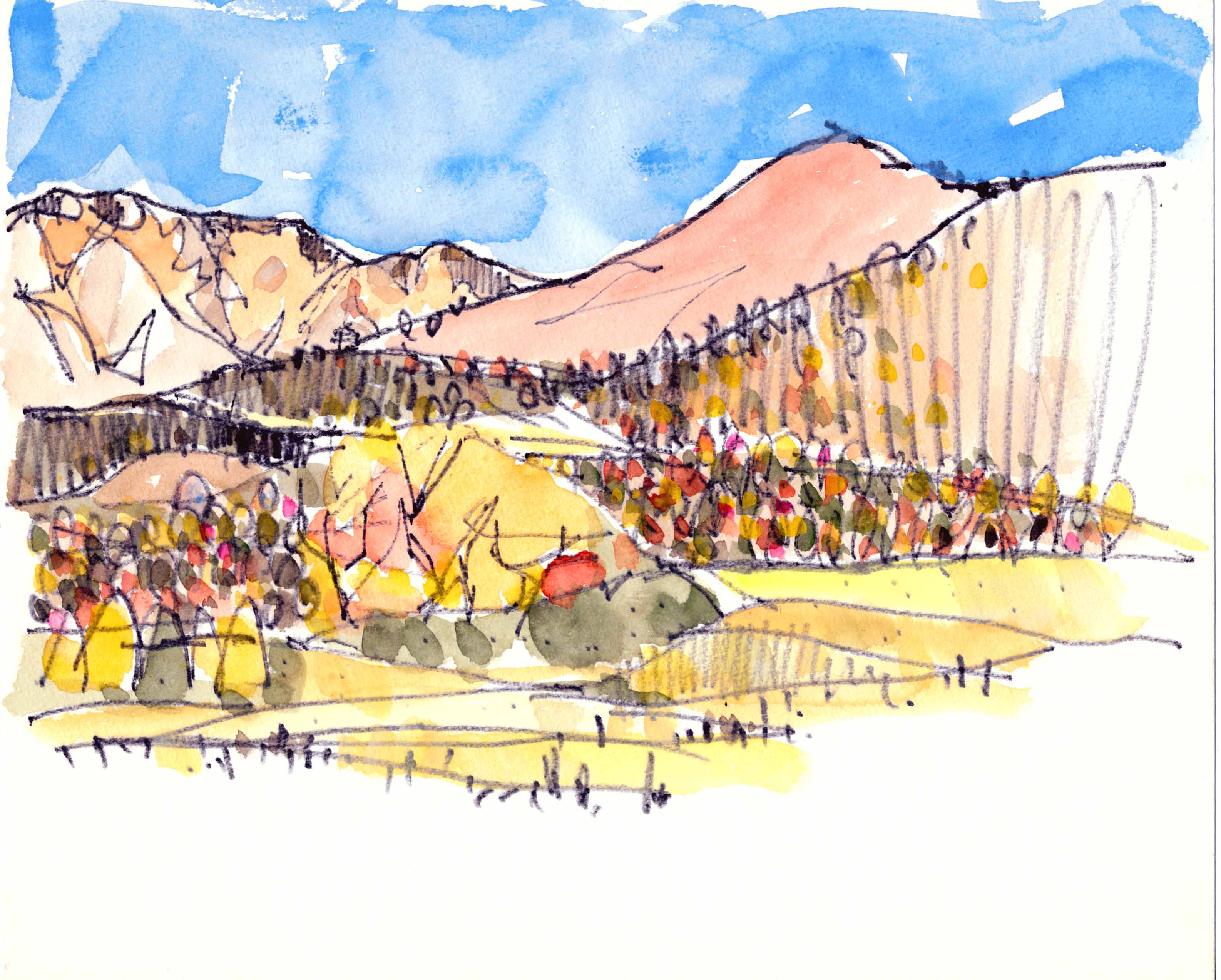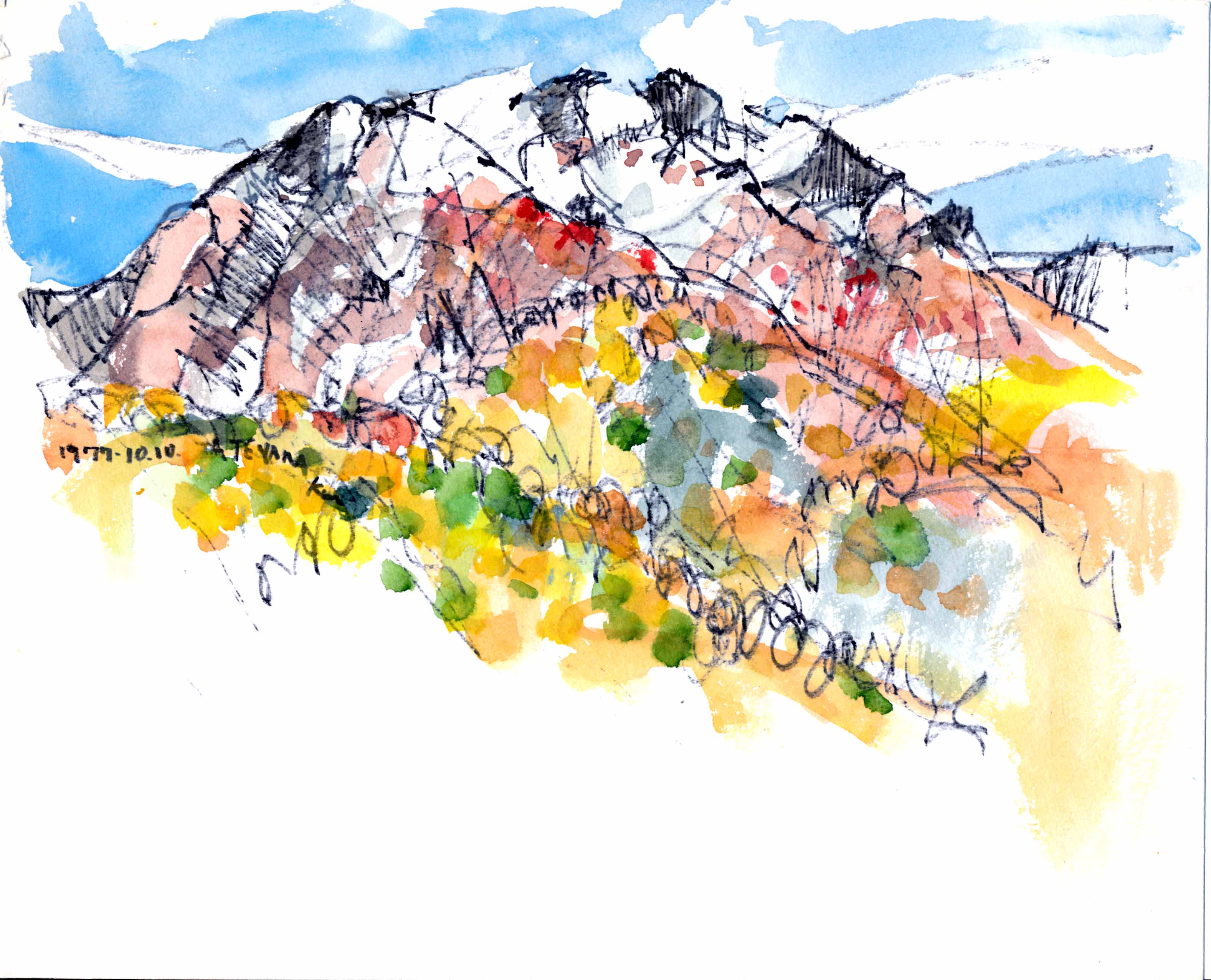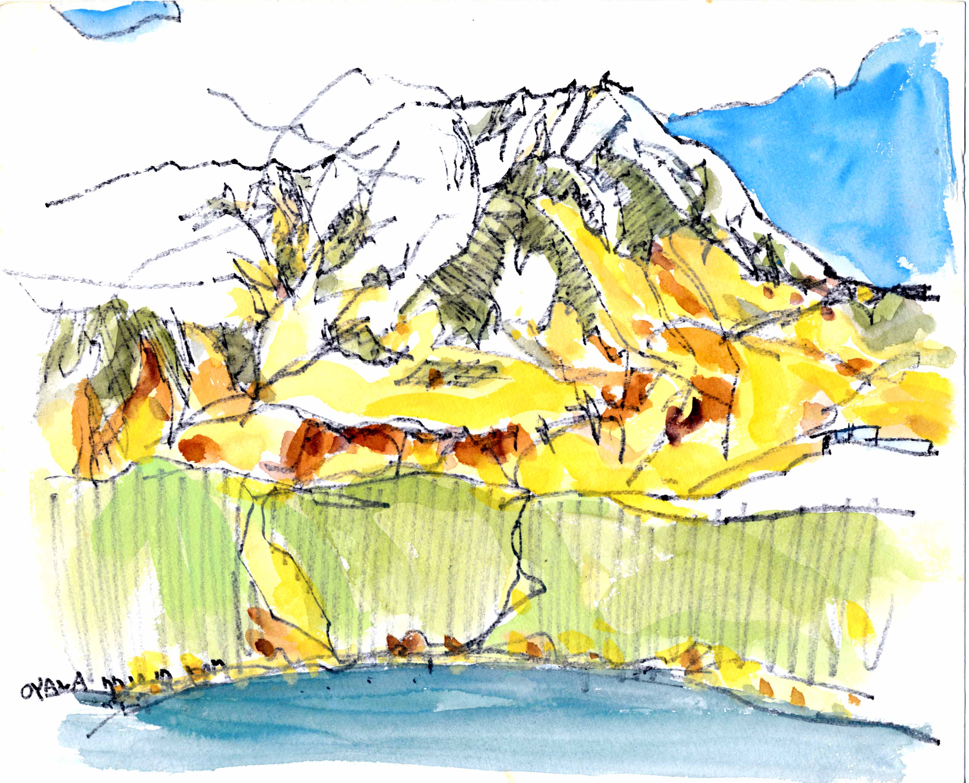 山崎カ-ルを抱えた立山が端正な姿を見せている。見開きのスケッチブックで