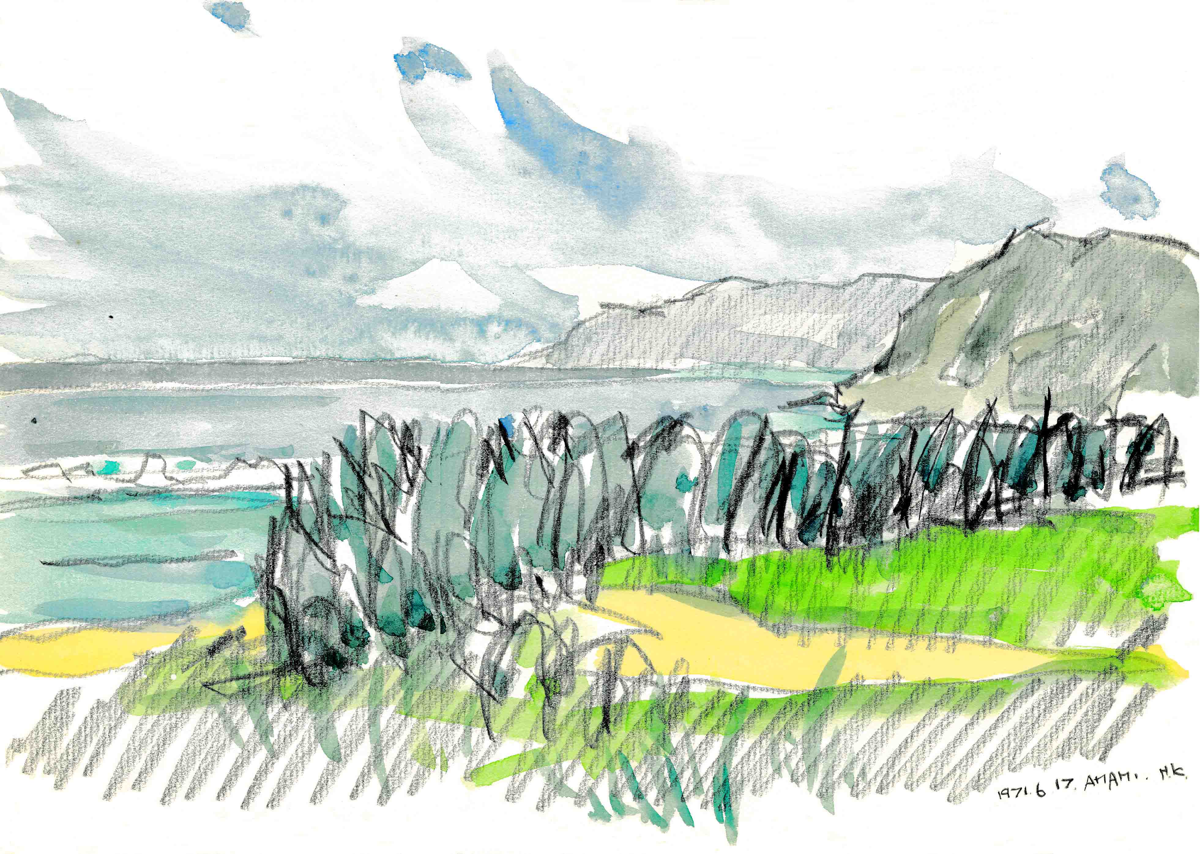 蒼い海と空に囲まれて、 開門岳と対岸の佐多岬をスケッチしましたが、