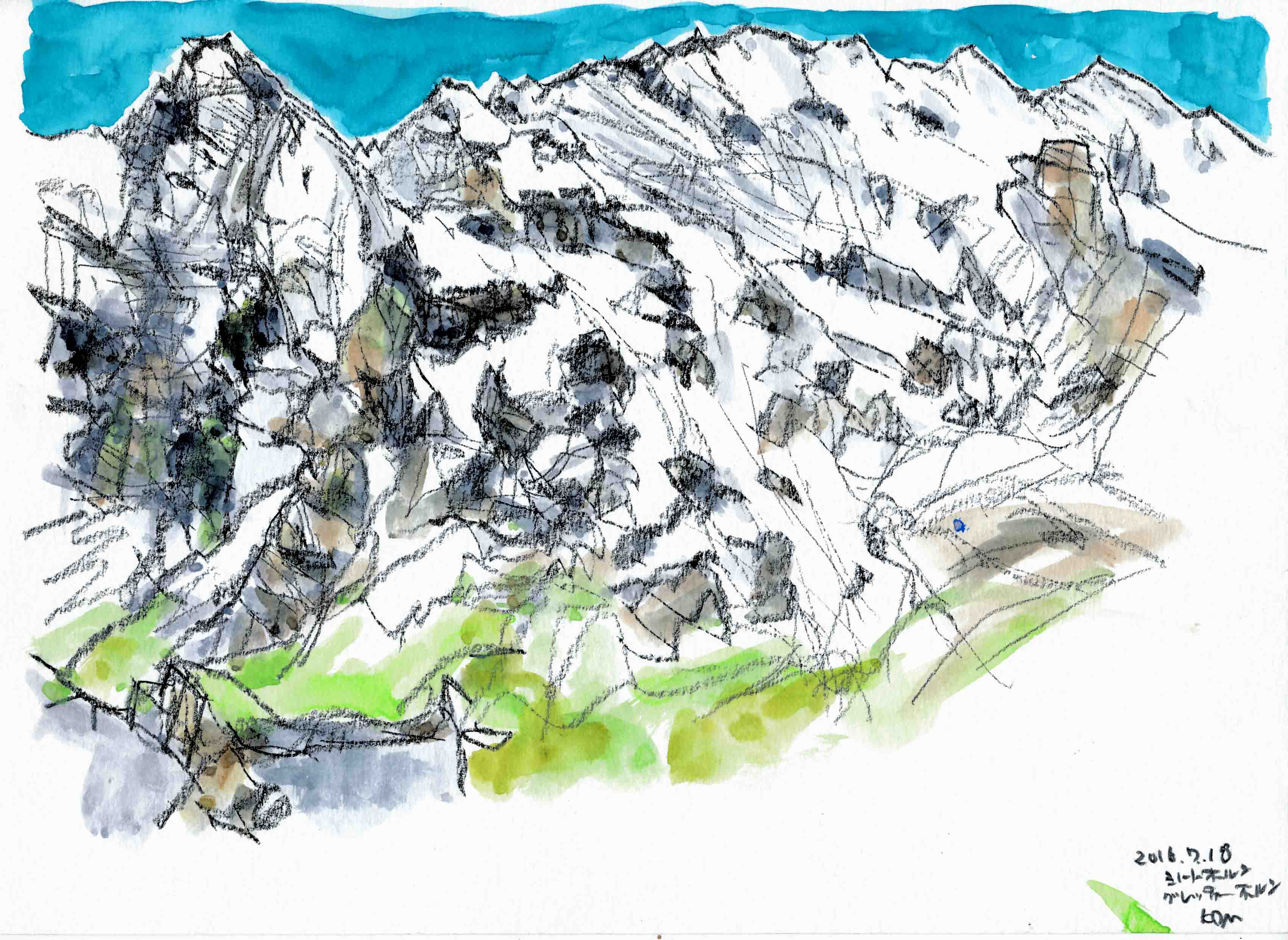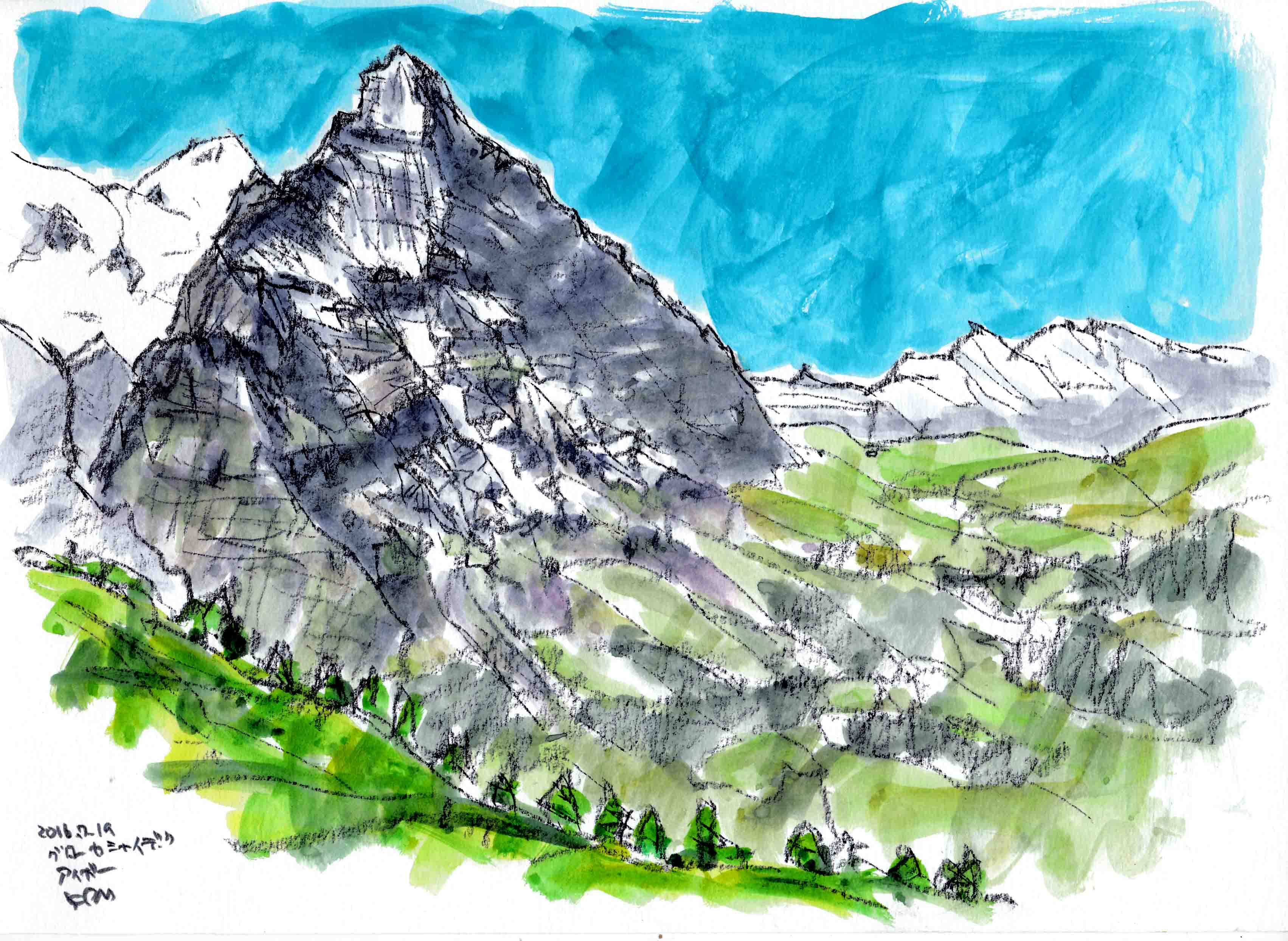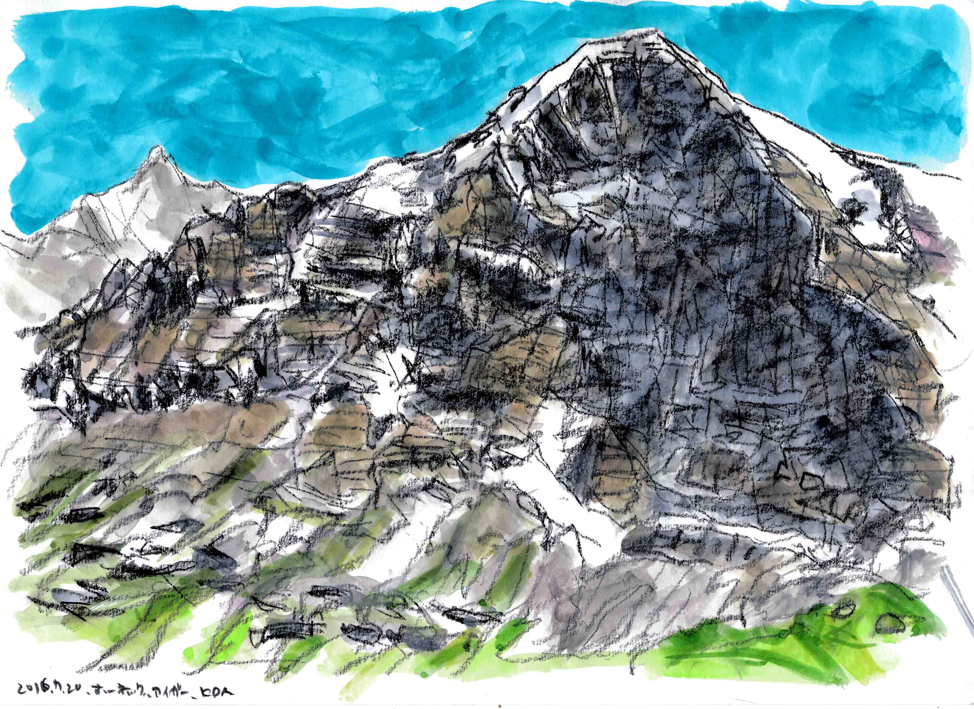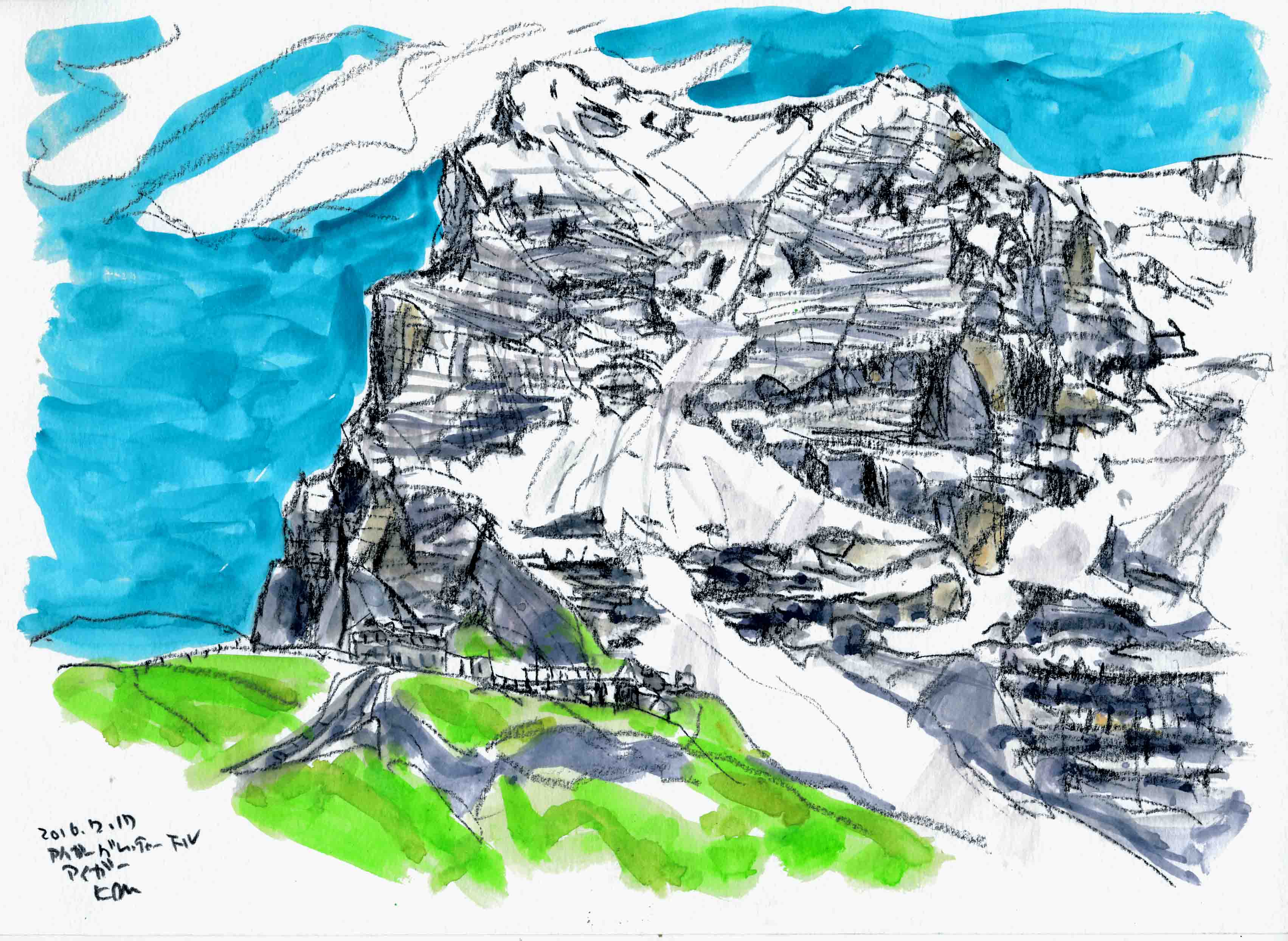 ■グロ-セ・シャイデック1961mからフィルスト2168mまでを、歩2時間、左手にアイガ-を始終見ながら歩く。途中でアイガ-のスケッチです。
