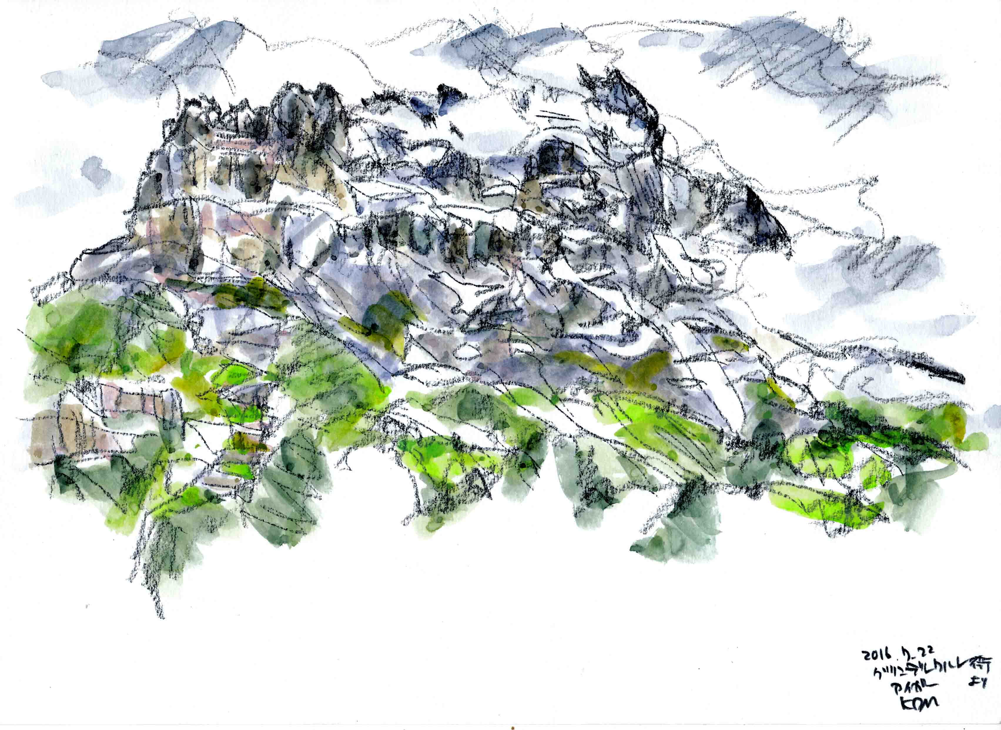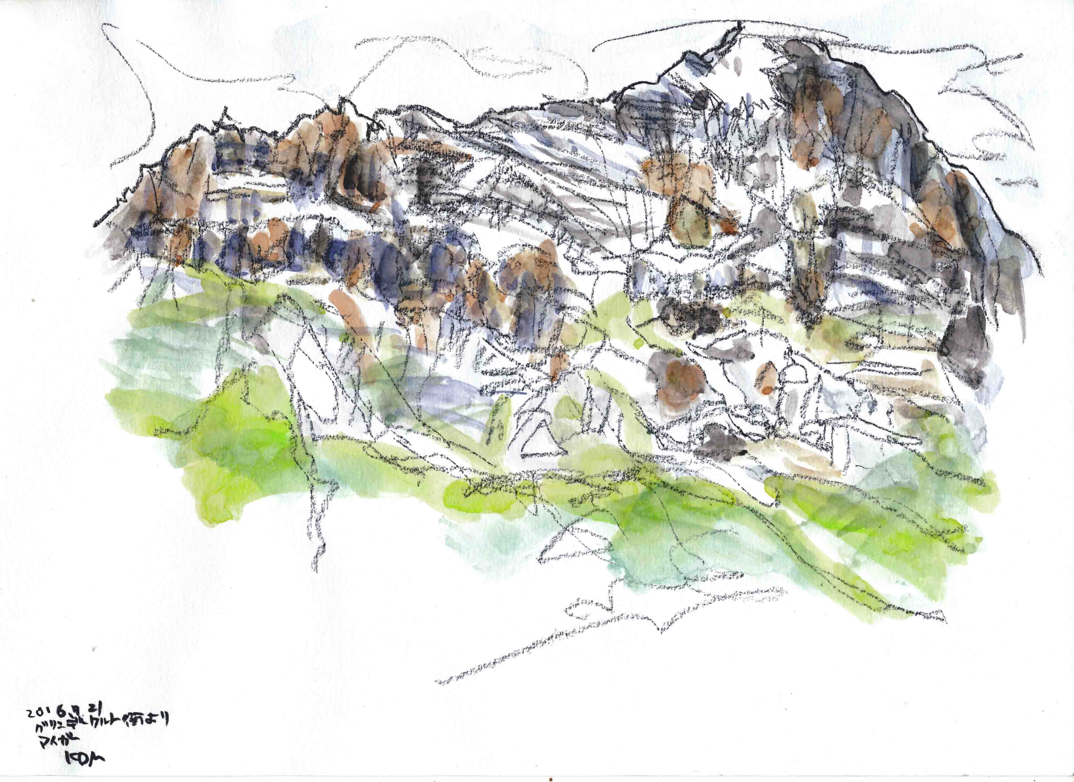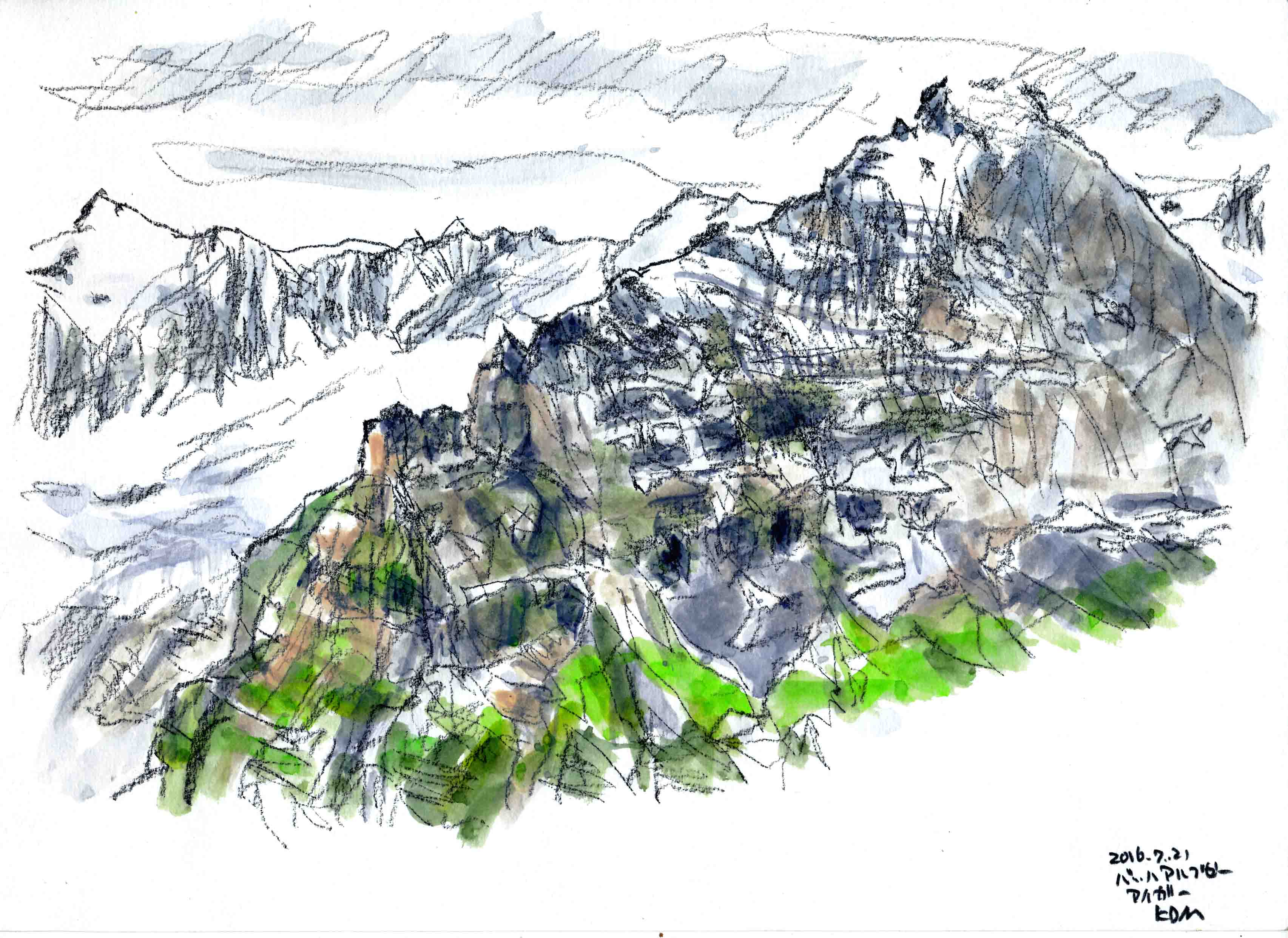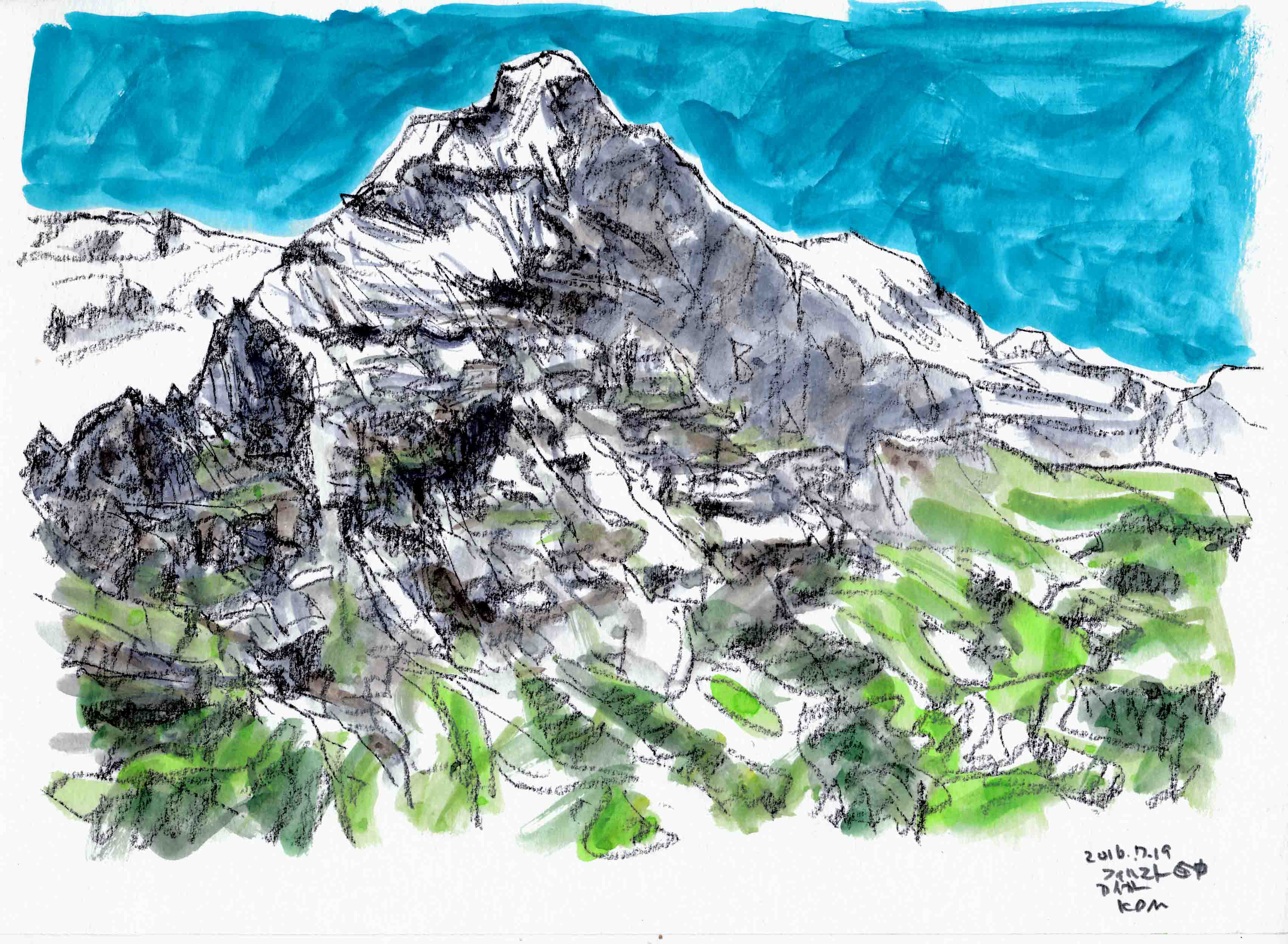 ■グロ-セ・シャイデック1961mからフィルスト2168mまでを、歩2時間、左手にアイガ-を始終見ながら歩く。途中でアイガ-のスケッチです。