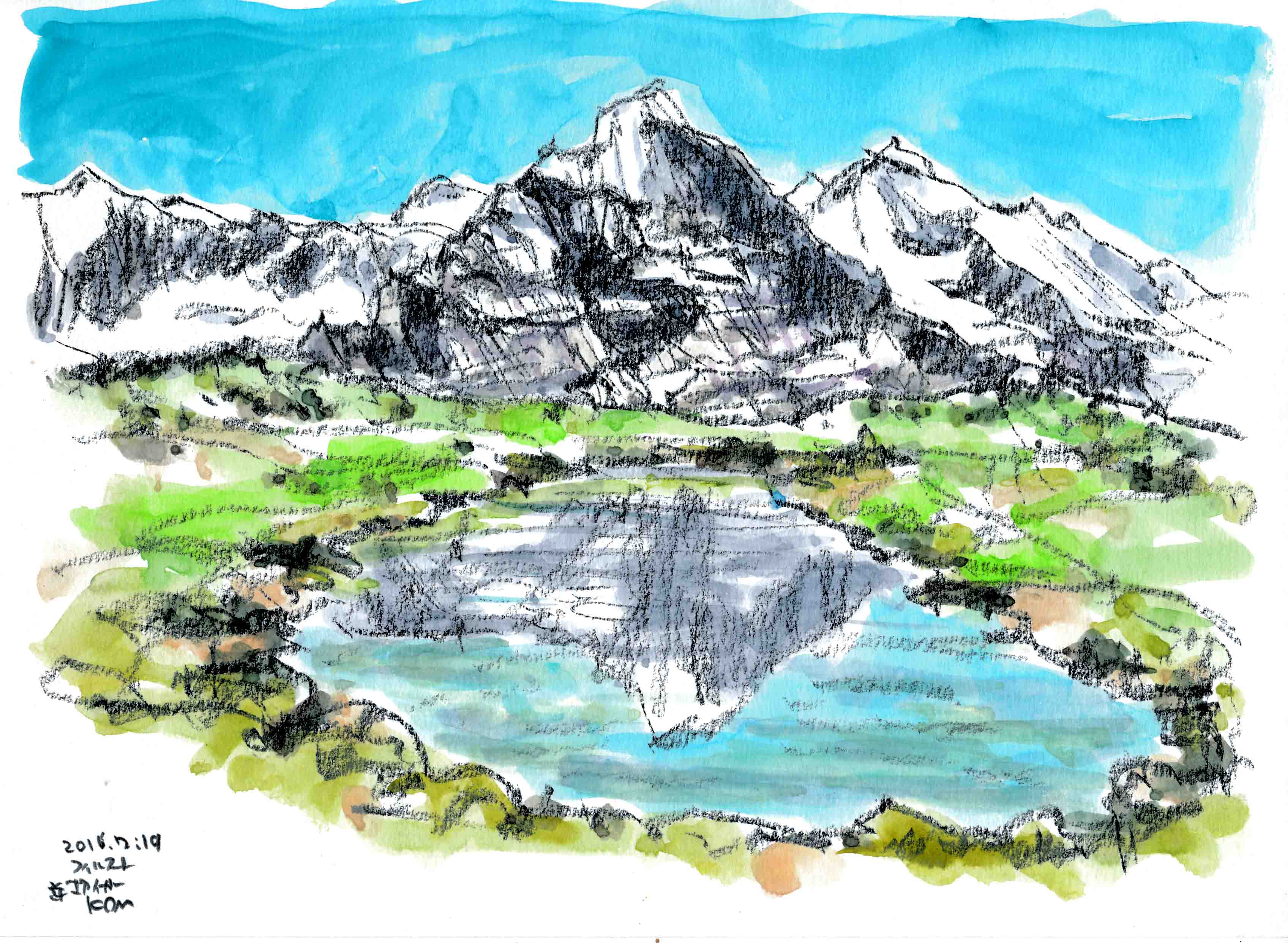 ■15日目(晴れ)グロ-セ・シャイデック1961mバス停で降り、道路を10m戻ると、右下に微かに下がる小道があります。電柱を目標に下り歩30分で、左手に小さな湖に会えます。BSでも放映された二か所目の「逆さアイガ-」です。湖畔から見ると、ミッテルレギ稜を従えたひときわ険しい姿の急峻なアイガ-と、湖に映った「逆さアイガ-」がくっきり見えました。夢中でスケッチしていると、後ろに人声が。初めて会ったのが日本人団体でした。