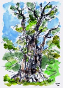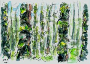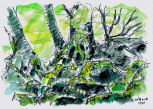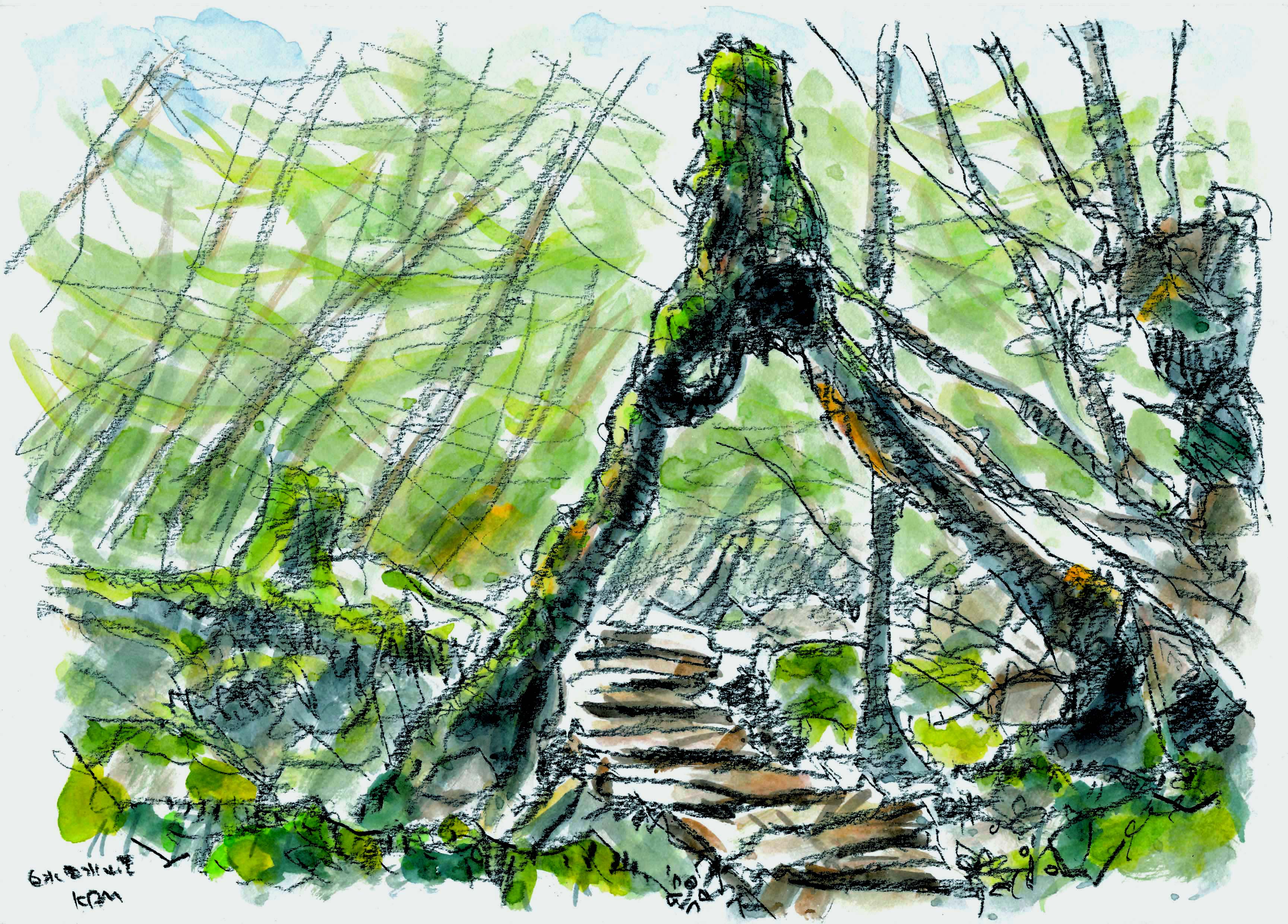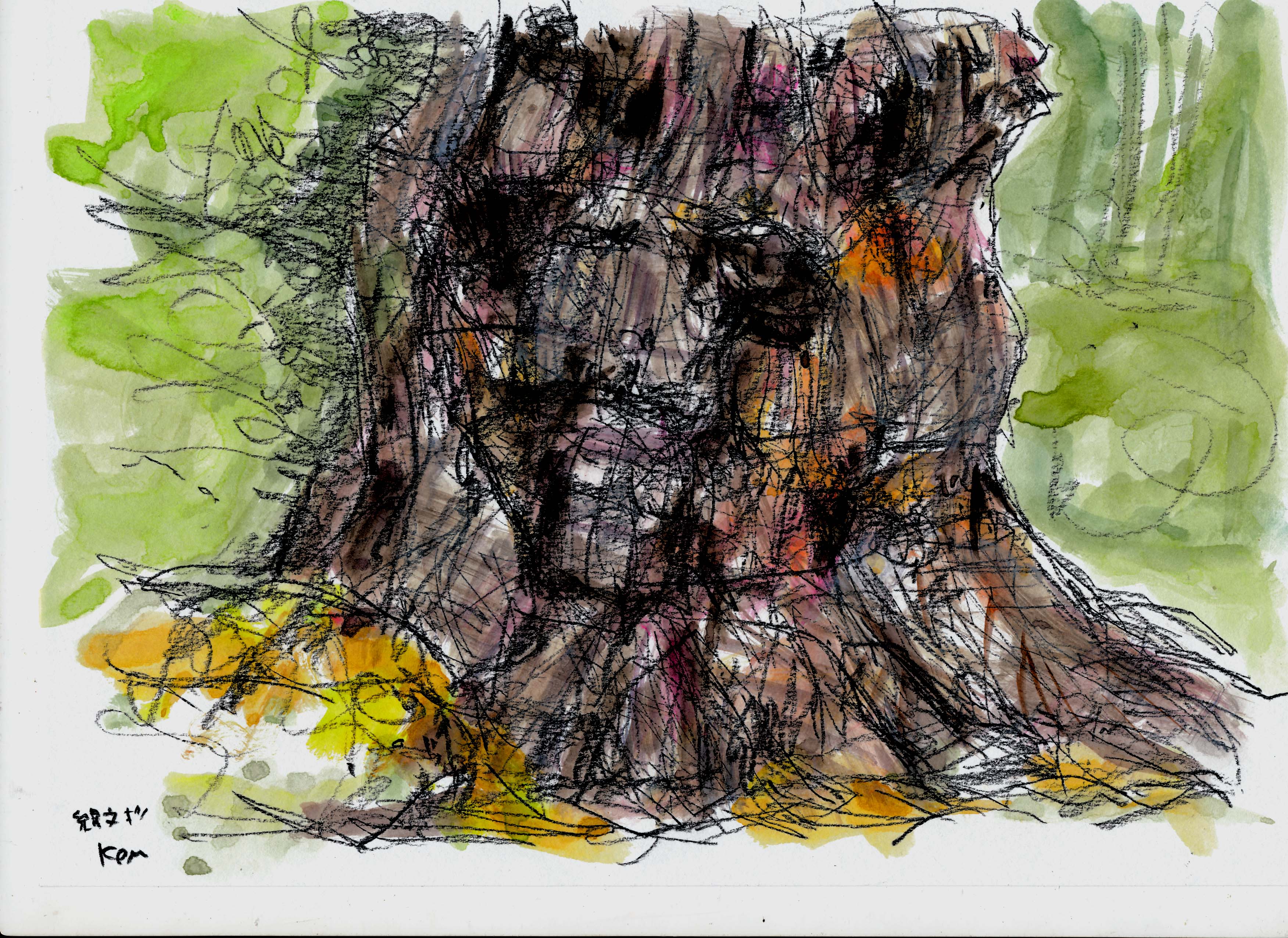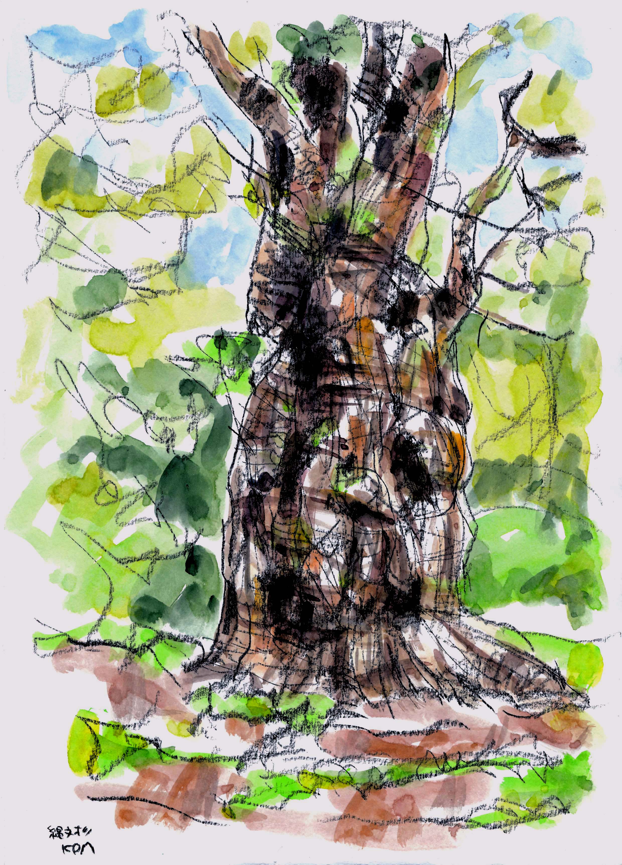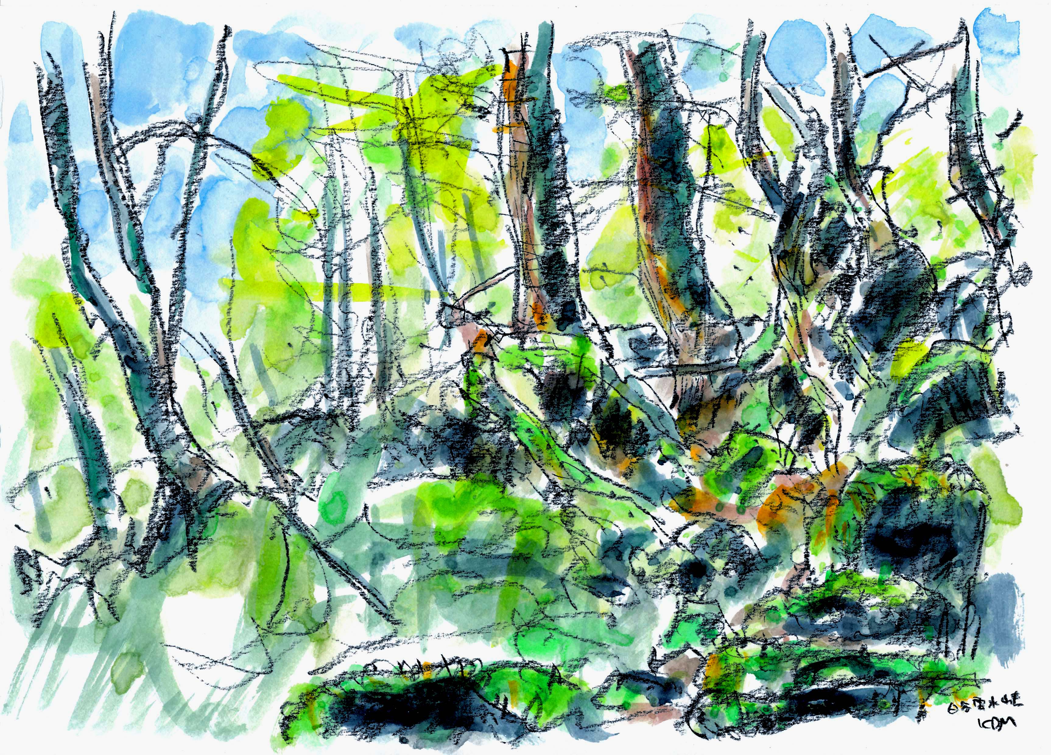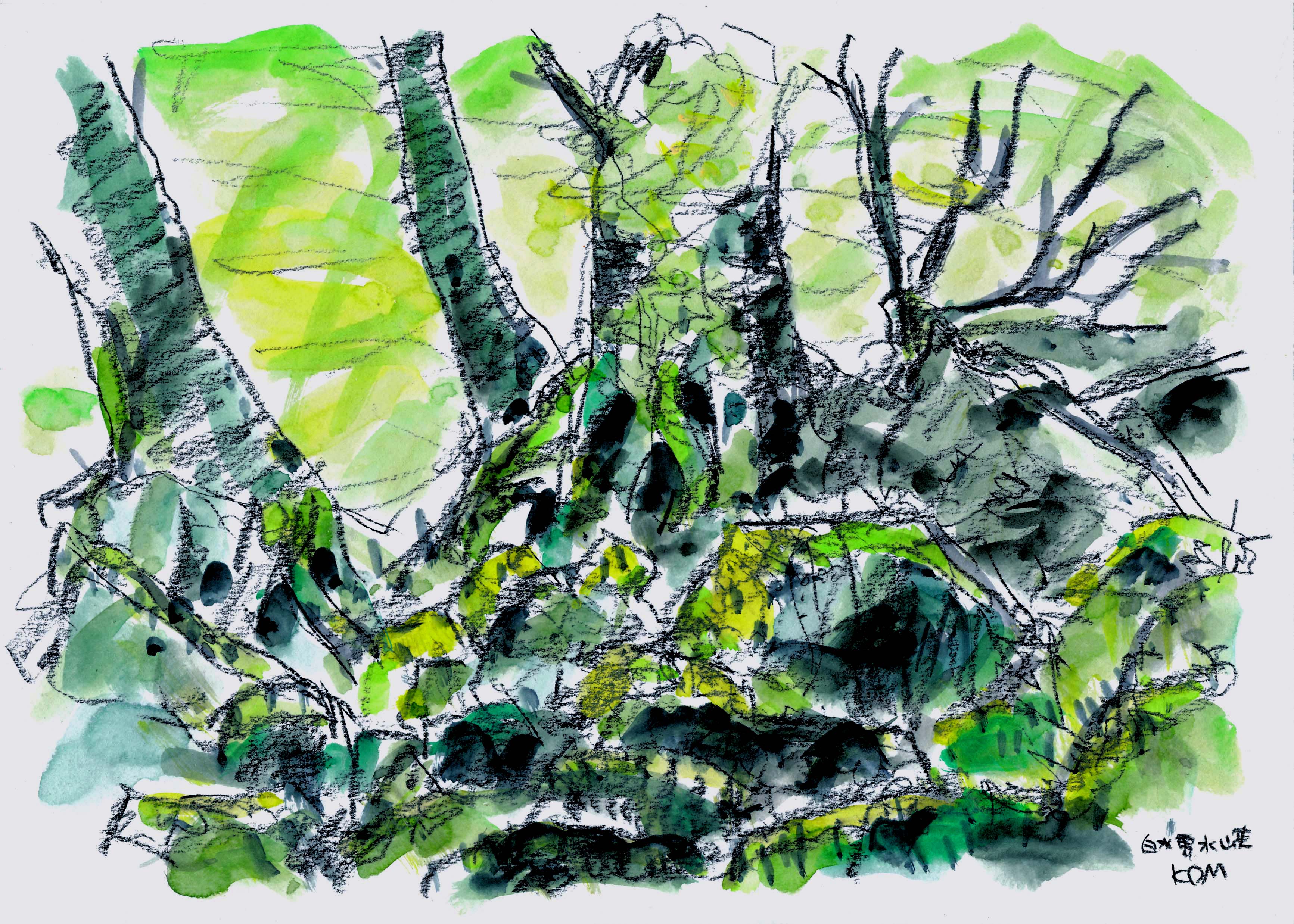 ■現地スケッチは、天候と団体行動の為出来ませんでした。帰ってから屋久島で撮った写真と旅行本を振り返って見ていると、現地で描けなかった残念と悔しさが心に沸き上がってきました。初めてスケッチブックを手に取り、屋久島の印象を描いていました。如何がでしょうか。