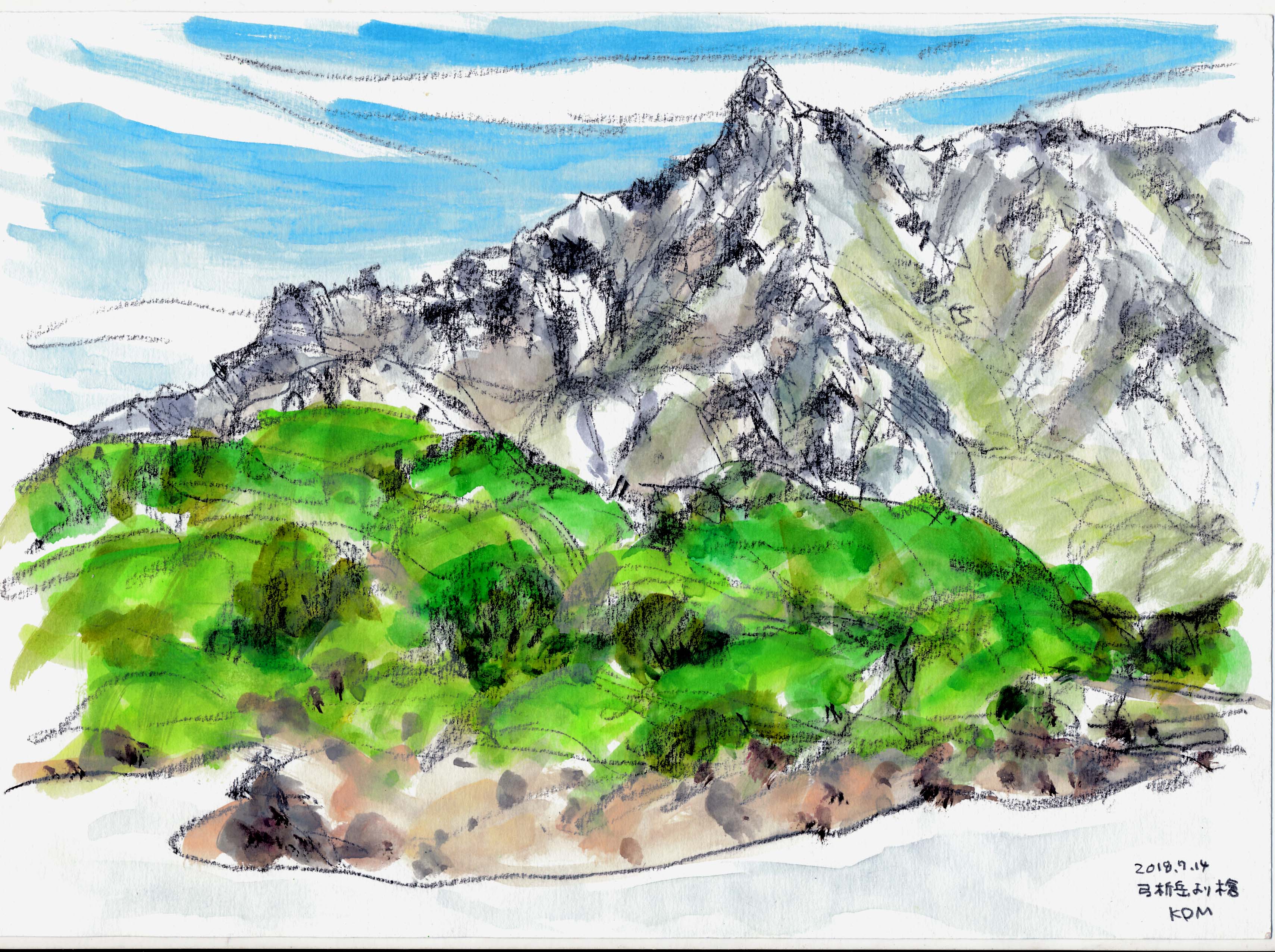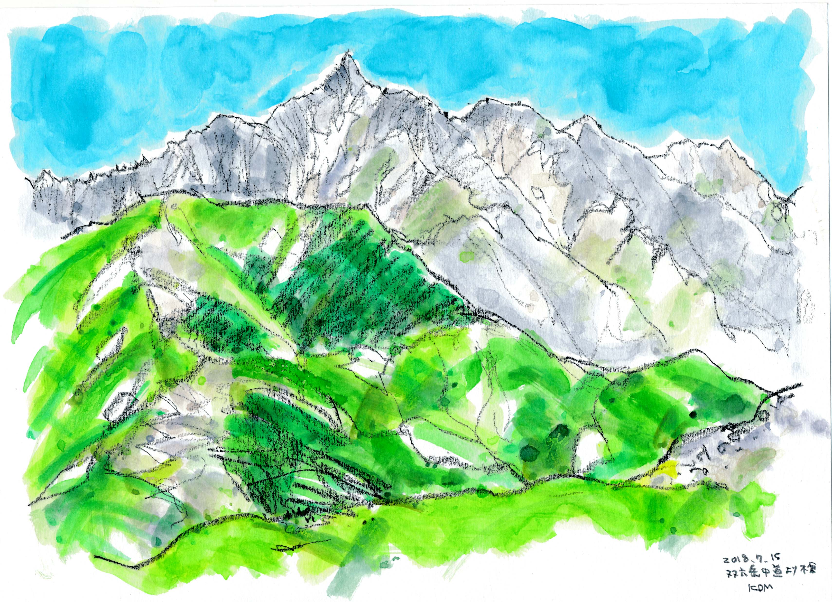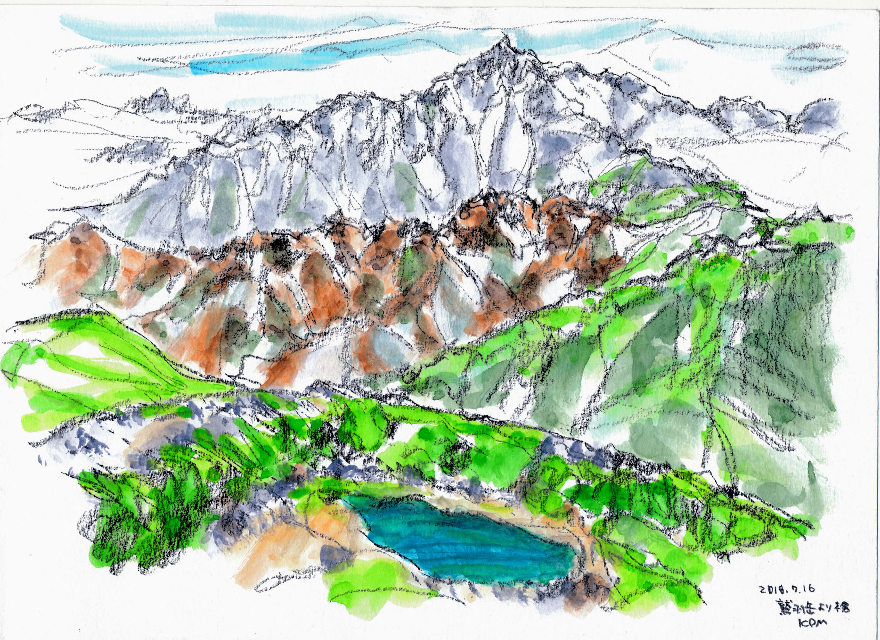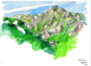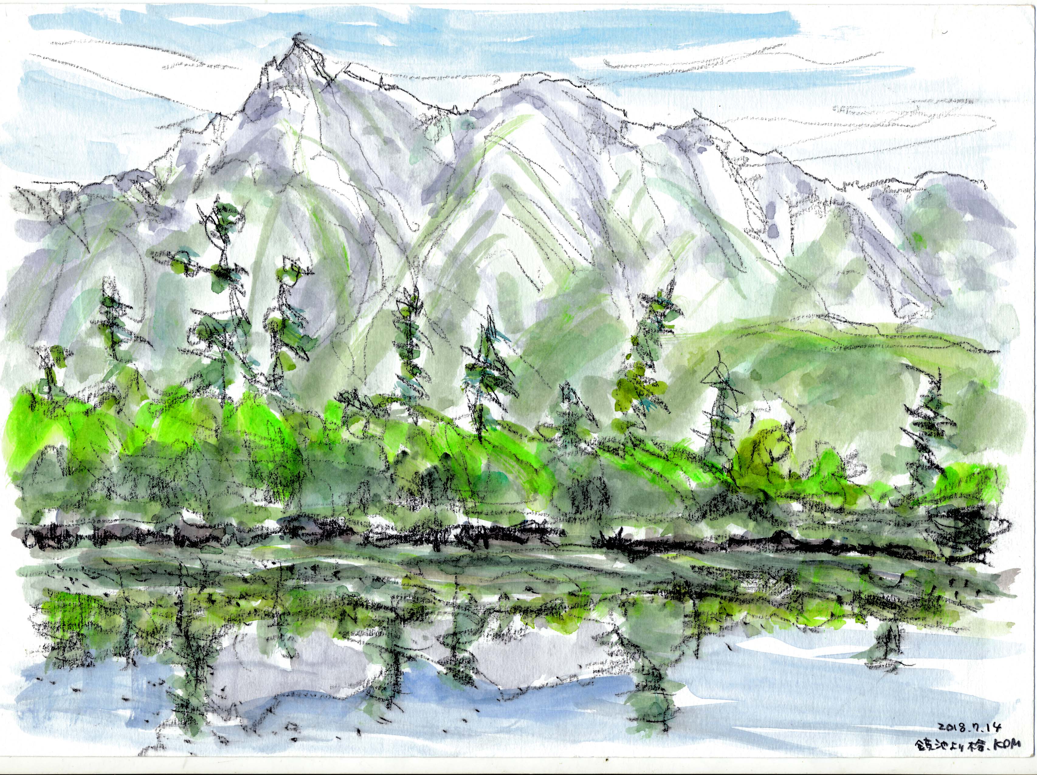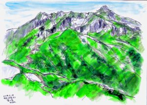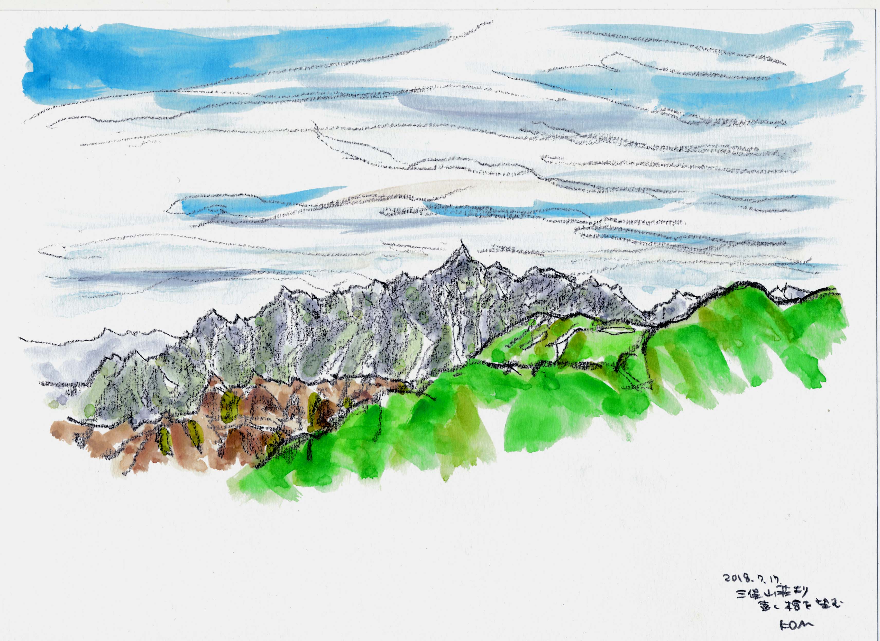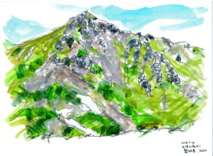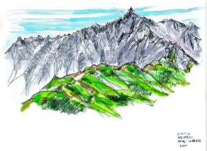 40年前の夏、職場の山岳部の仲間と、折立から薬師岳・黒部五郎岳・三俣蓮華岳・双六岳・新穂高温泉を歩きました。今年の7月の梅雨明けに、逆に新穂高温泉・双六岳・三俣蓮華岳・鷲羽岳をスケッチ山行しました。天候に恵まれて、槍ヶ岳を十分に描くことが出来ました。