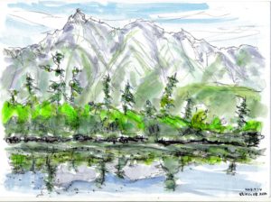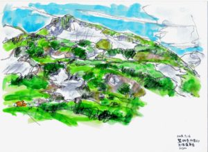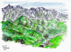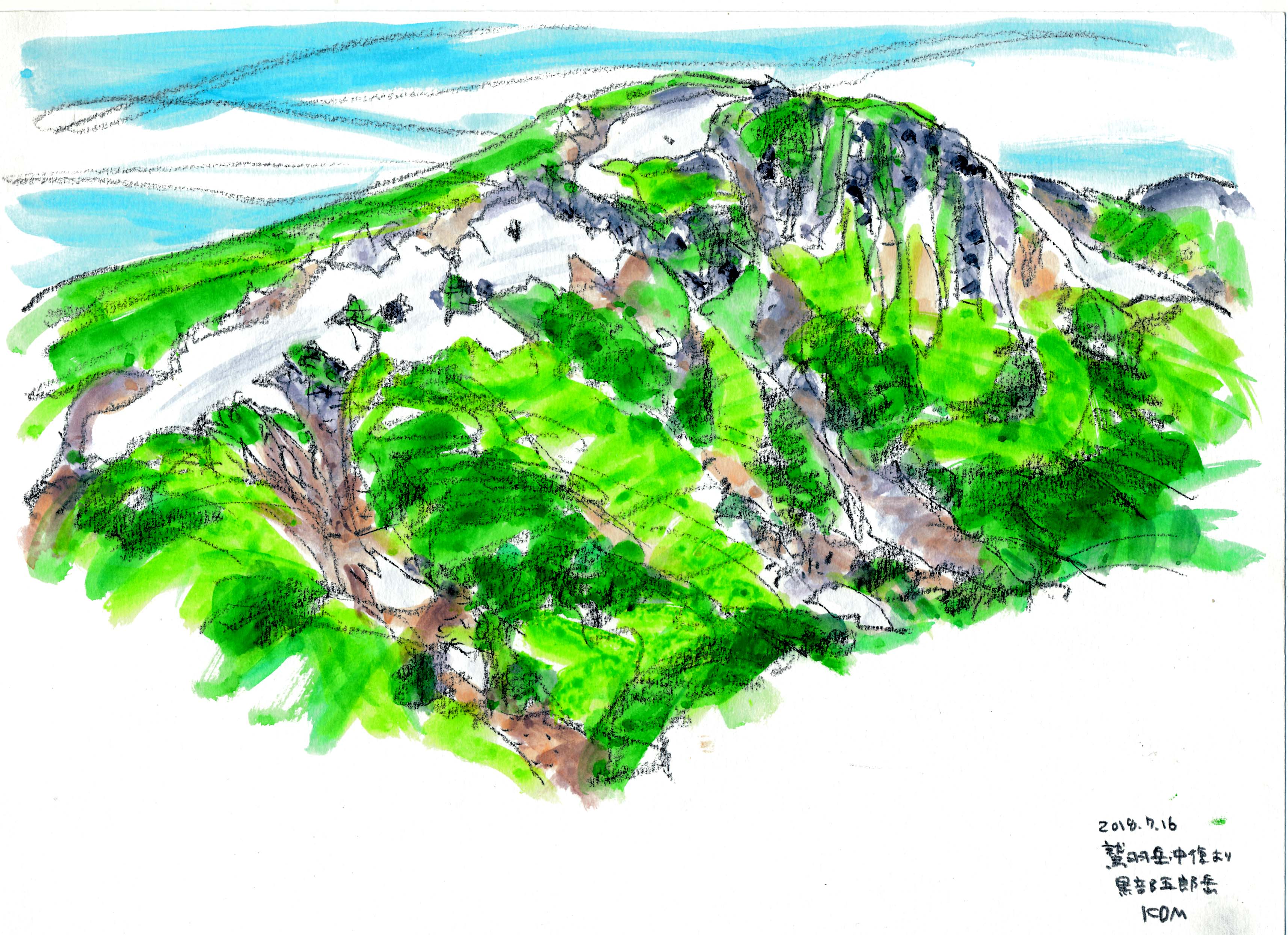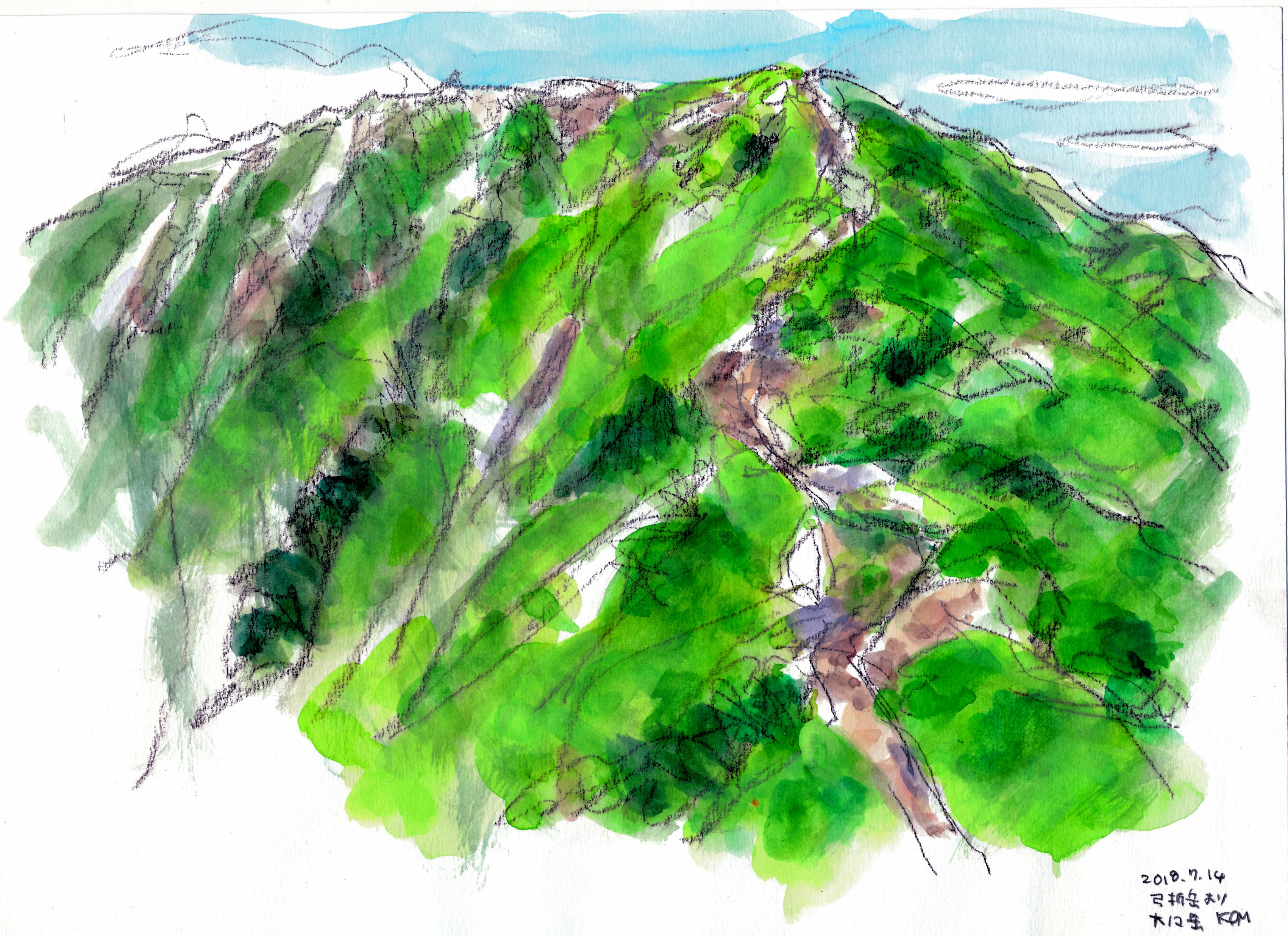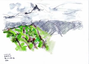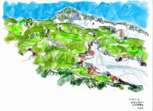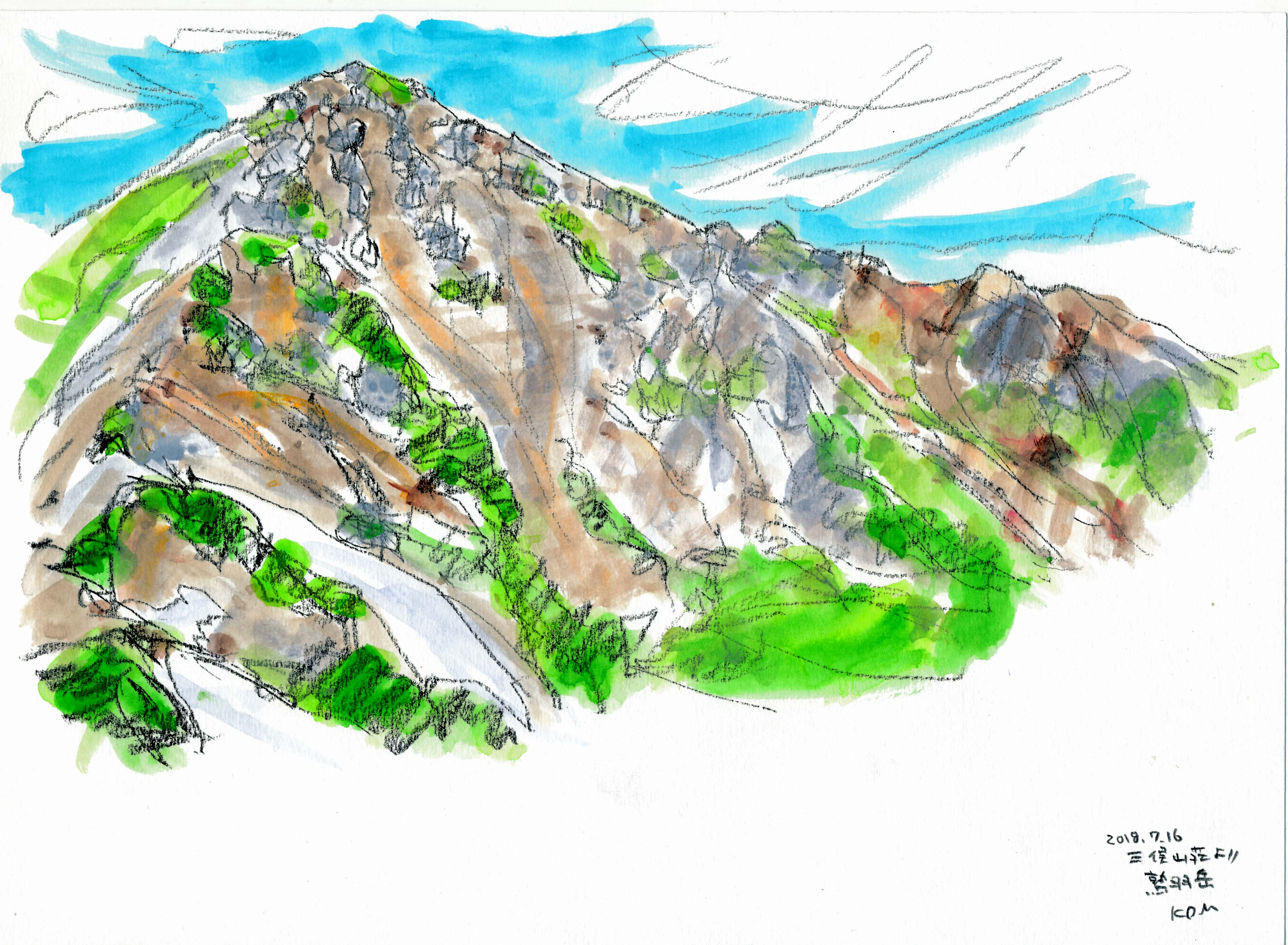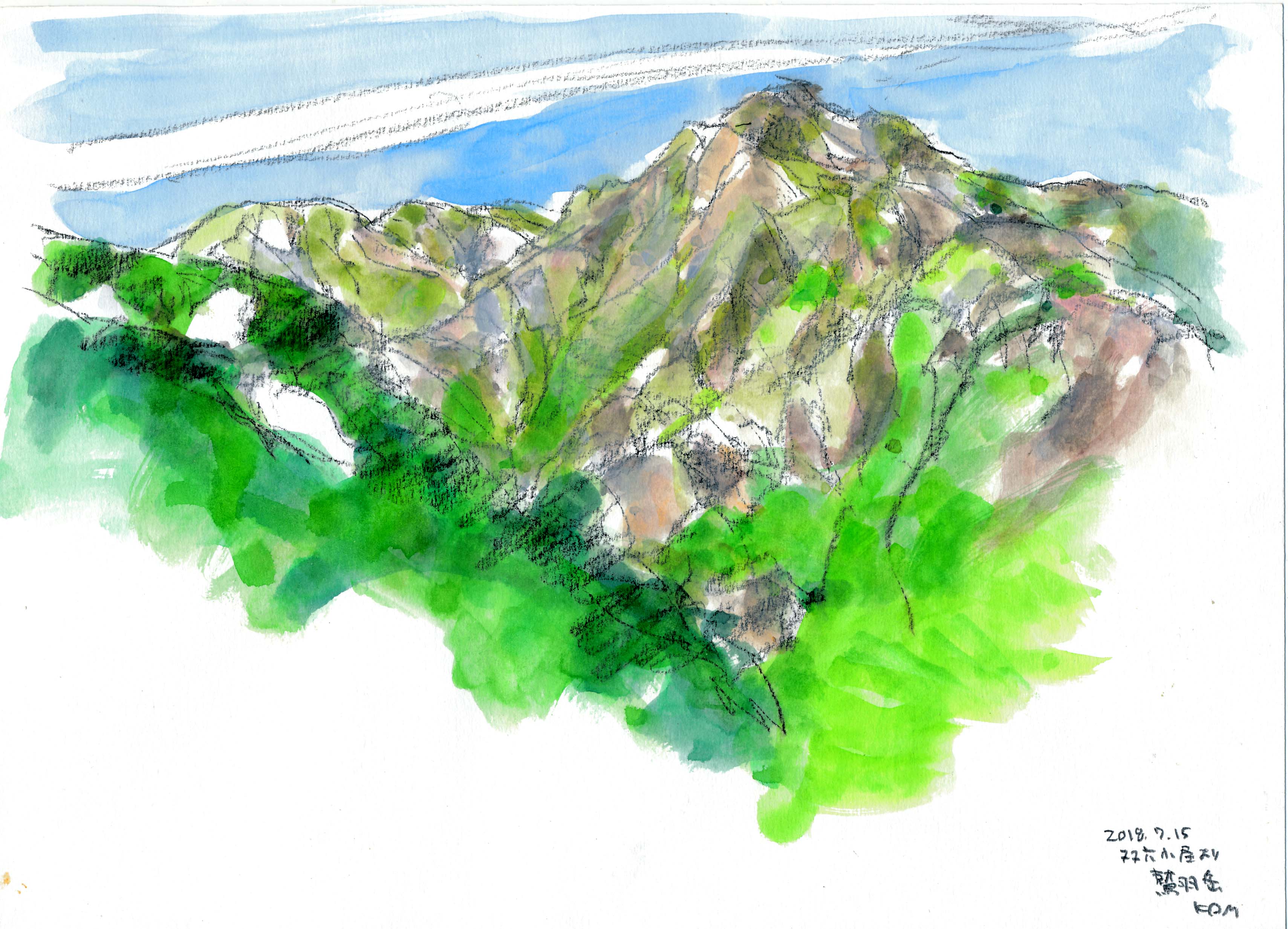 40年前の夏、職場の山岳部の仲間と、折立から薬師岳・黒部五郎岳・三俣蓮華岳・双六岳・新穂高温泉を歩きました。今年の7月の梅雨明けに、逆に新穂高温泉・双六岳・三俣蓮華岳・鷲羽岳をスケッチ山行しました。天候に恵まれて、槍ヶ岳を十分に描くことが出来ました。