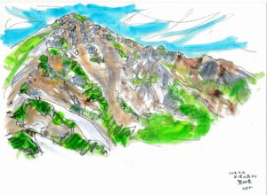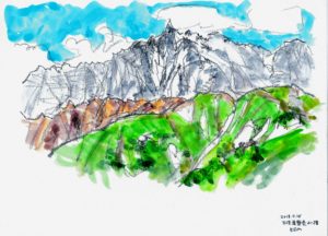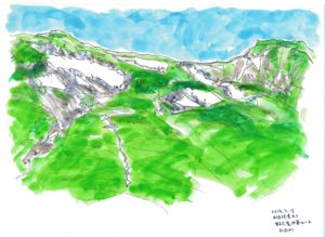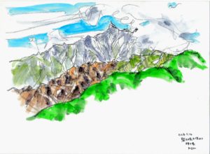 山荘のそばの展望台から朝の槍ヶ岳を描きました。巻道ルートは雪渓に残雪が多いから注意してとの、アドバイスがありました。分岐でスケッチしながら、登山者に聞くと注意すればOKとの事で歩きました。最後の雪渓が緊張しましたが大丈夫でした。一昨日の中道コ-ス分岐に着くと、槍ヶ岳がまじかに見えて安心しました。