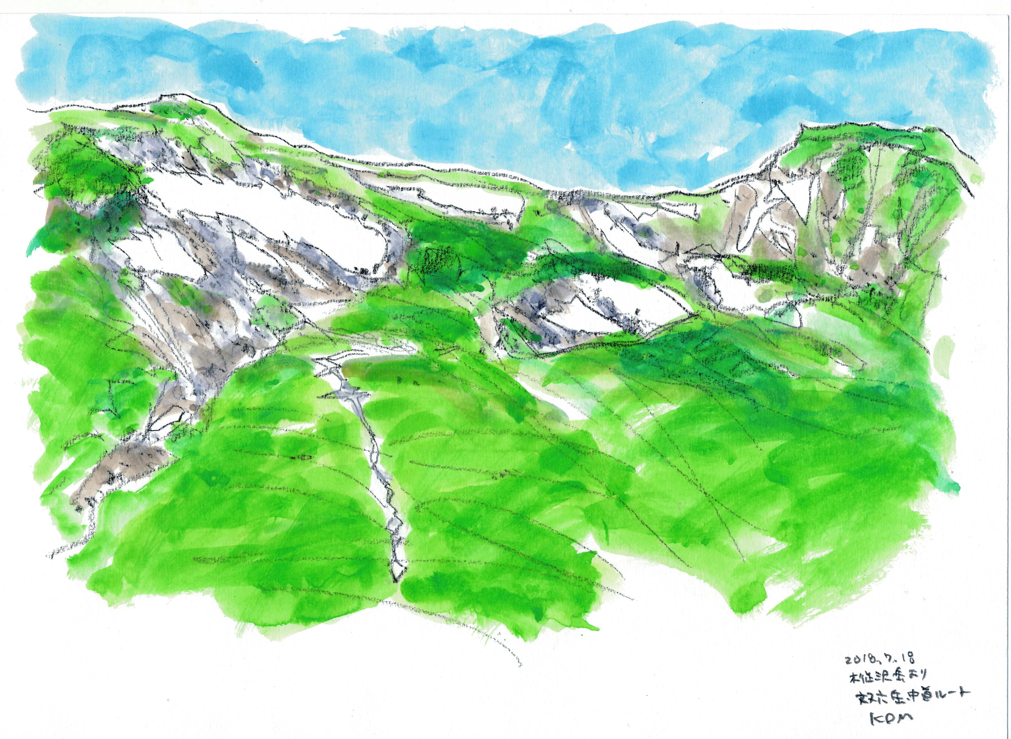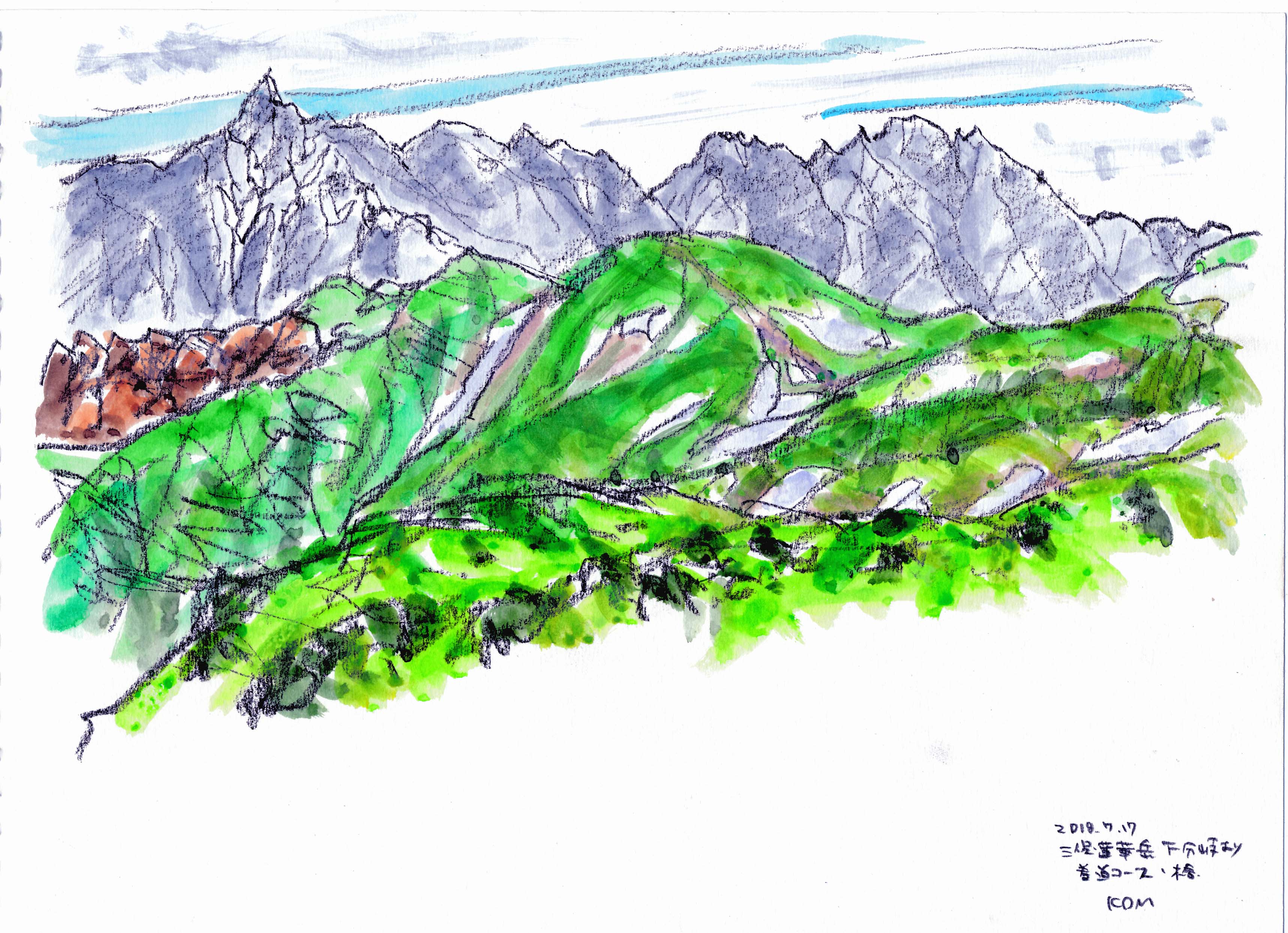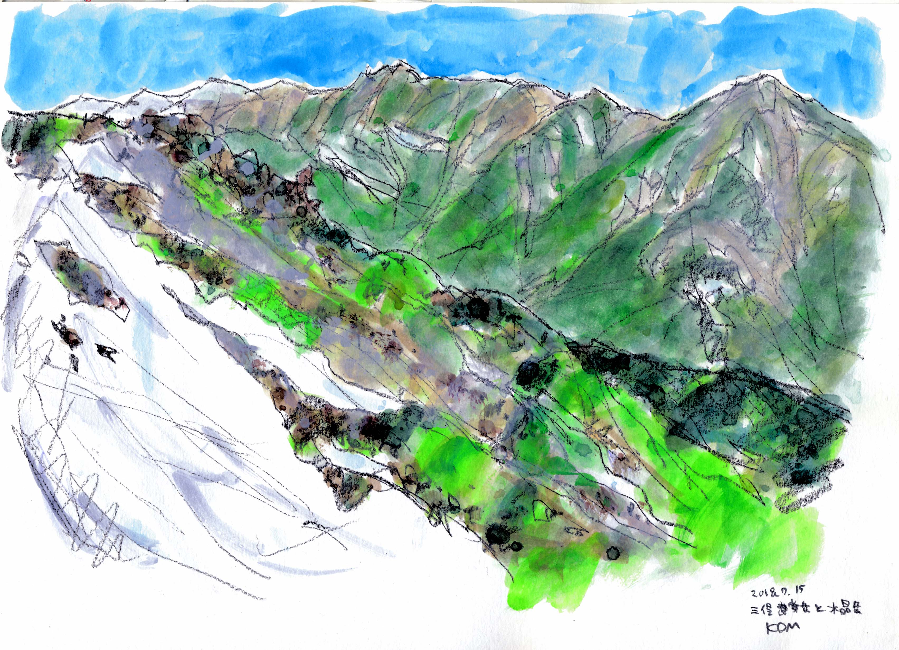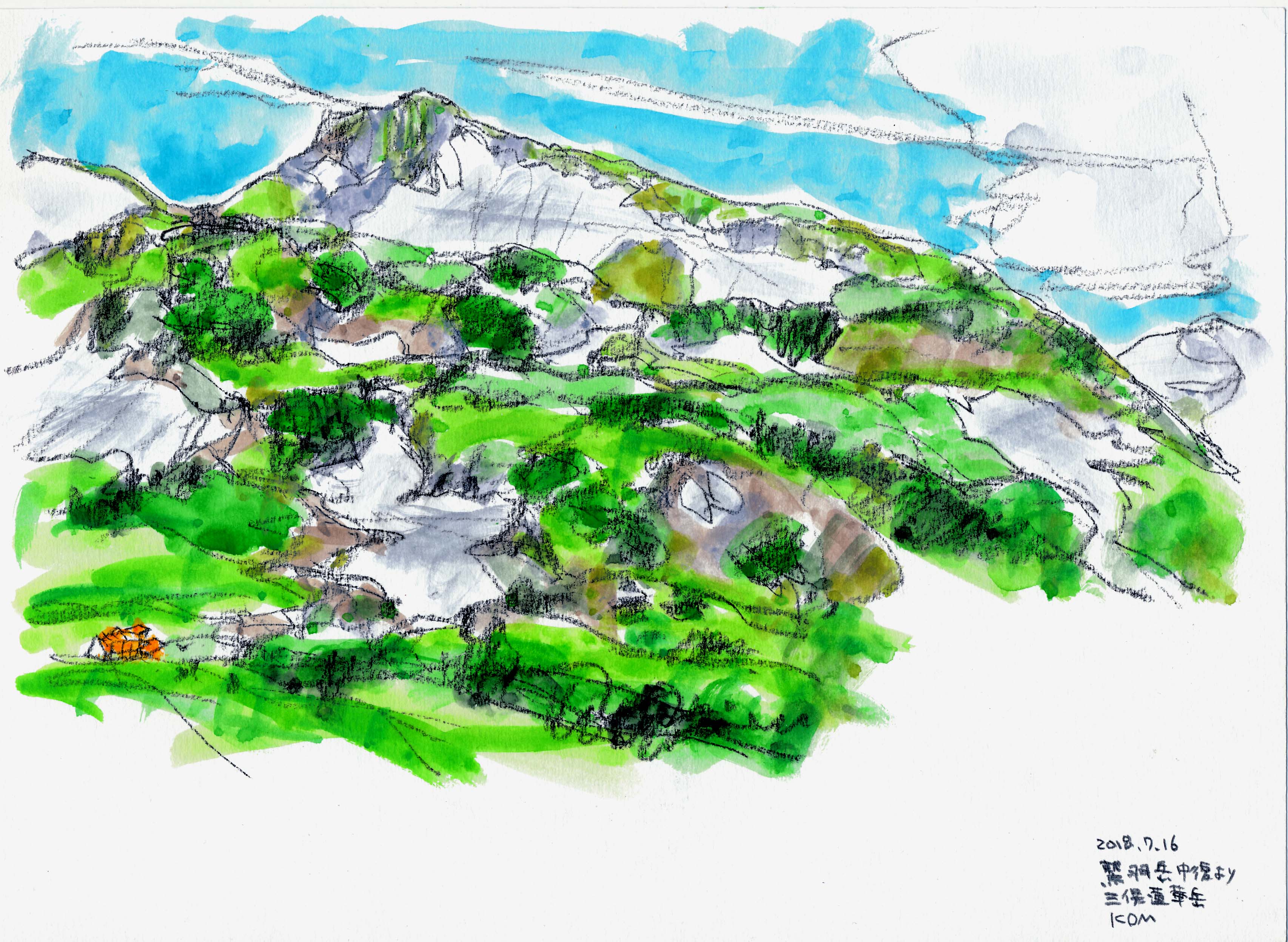 双六岳直登ルートは雪渓に残雪が多く禁止の為、中道コ-スを行く。スイスの山麓を歩いているような快適な散歩道。展望の良い丘から、槍ヶ岳と双六岳中腹を描いた。分岐で双六岳を直登する。双六岳(2860m)の頂上台地から見る平らな稜線と荒々しい槍ヶ岳・穂高連峰の絶妙な組合せは最高の組合せでした。双六岳そして三俣蓮華岳山頂(2841m)で岐阜県・長野県・富山県の県境を感じて下りました。最後のハイマツのトンネルを過ぎると、三俣山荘(2540m)が目の前です。