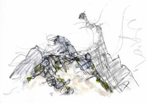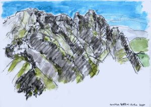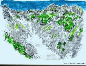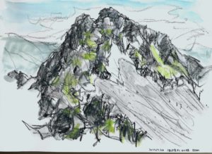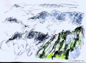 2022年夏に奥穂高岳にてスケッチ山行しました。梅雨明けで下界では天候に恵まれましたが、穂高連峰は午前10時までは晴れて周囲が一望されていましたが、その後は山肌は雲・霧に囲まれて、描くのに苦労し、時には頂上で4時間待機を余儀なくされました。冷たい山風の中で、jazz奏者アートペッパ-のサックスに魅了されていました。