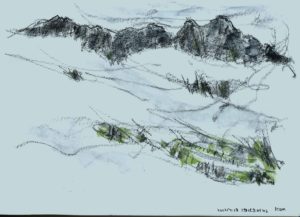 朝一番小屋からスケッチ一枚。一日中、ウオ-クマンでjazzを聴きながら、小屋の図書室で 山の本を見たり、写真集からスケッチを描いて過ごしていました。